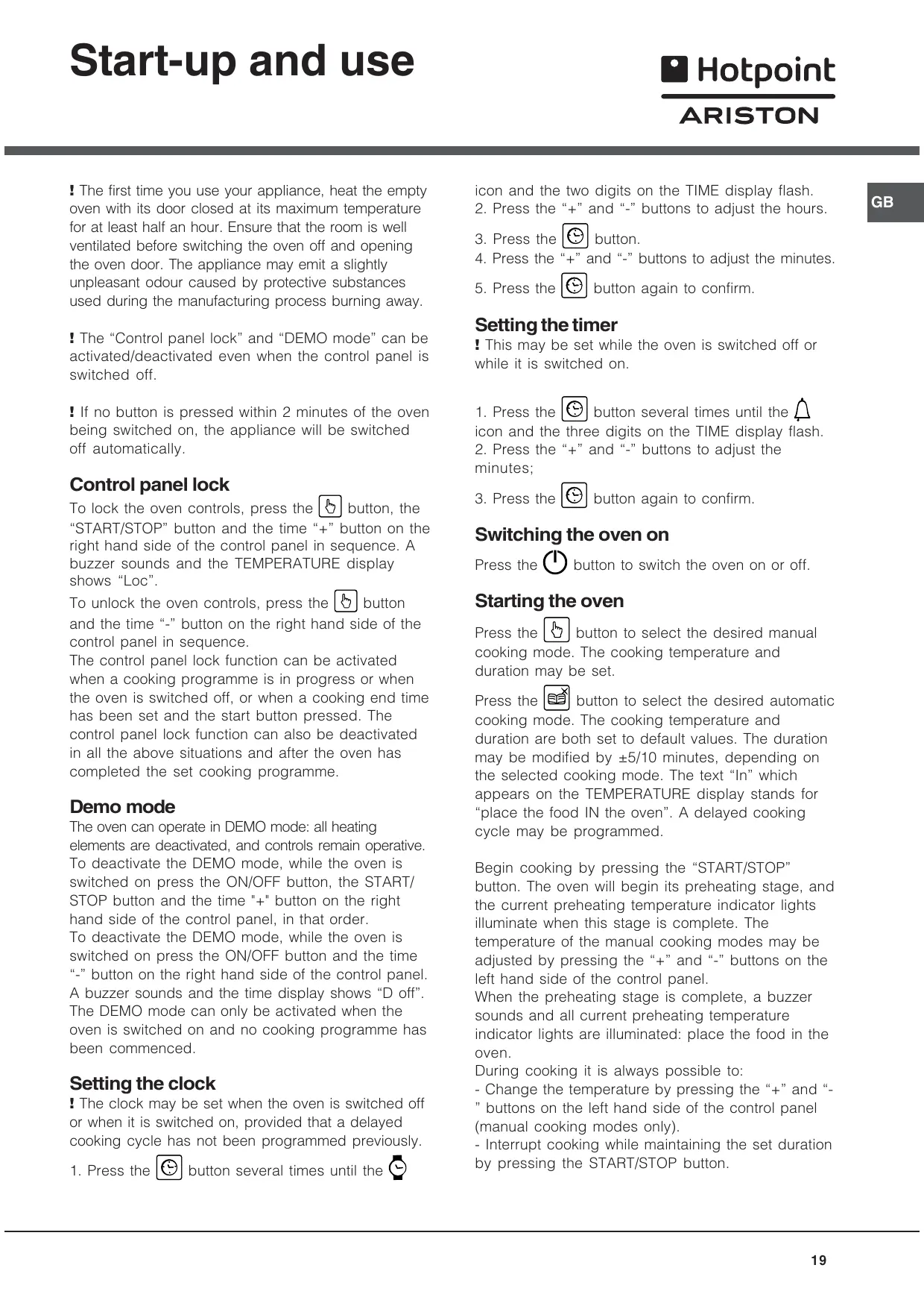 The first time you use your appliance, heat the empty oven with its door closed at its maximum temperature for at least half an hour. Ensure that the room is well ventilated before switching the oven off and opening the oven door. The appliance may emit a slightly unpleasant odour caused by protective substances used during the manufacturing process burning away. The Control panel lock and DEMO mode can be activated/deactivated even when the control panel is switched off. If no button is pressed within 2 minutes of the oven being switched on, the appliance will be switched off automatically.