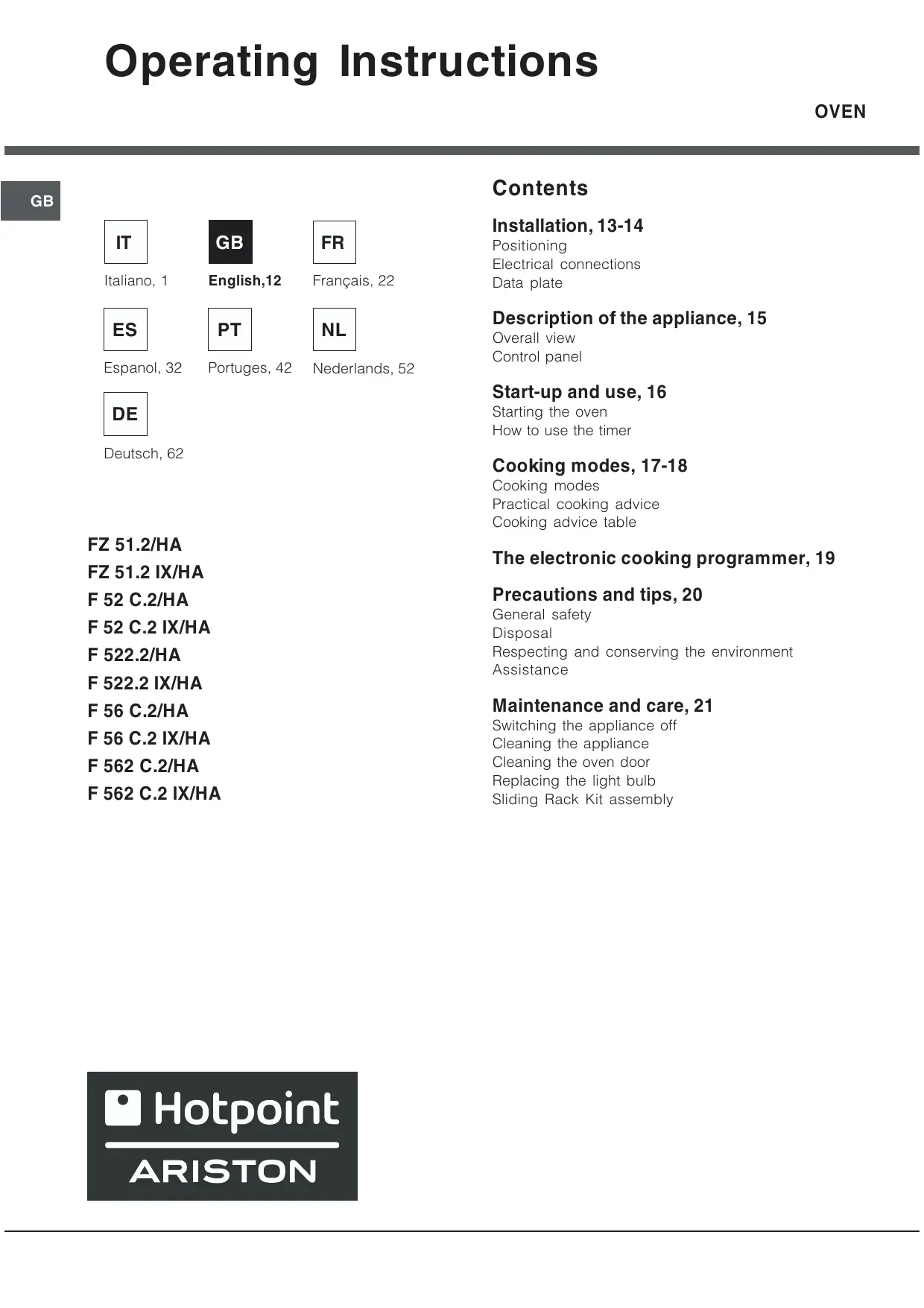 USER MANUAL FZ 51.2 IX/HA HOTPOINT