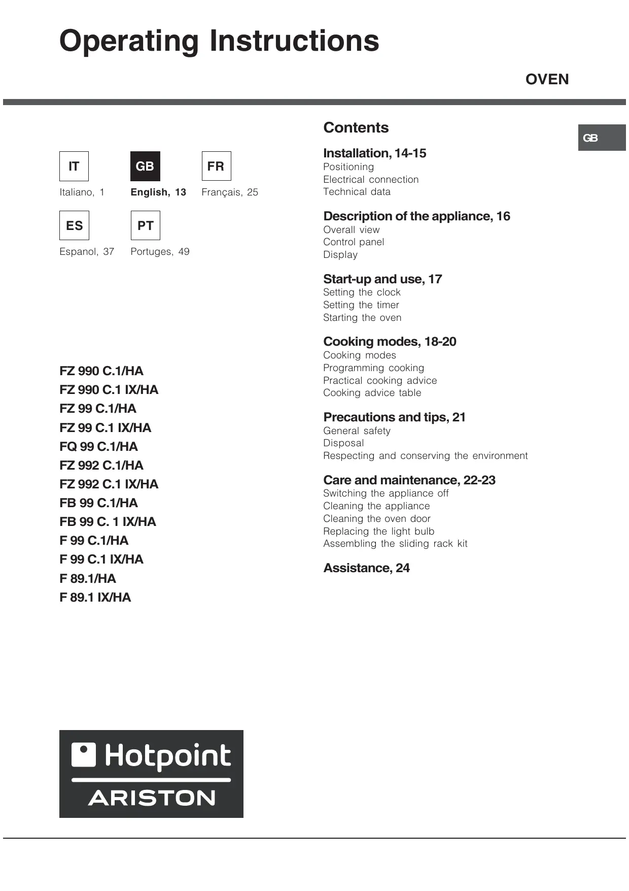 Français, 25 Installation, 14-15 Positioning Electrical connection Technical data Description of the appliance, 16 Overall view Control panel Display Start-up and use, 17 Setting the clock Setting the timer Starting the oven Cooking modes, 18-20 FZ 990 C.1/HA FZ 990 C.1 IX/HA FZ 99 C.1/HA FZ 99 C.1 IX/HA FQ 99 C.1/HA FZ 992 C.1/HA FZ 992 C.1 IX/HA FB 99 C.1/HA FB 99 C. 1 IX/HA F 99 C.1/HA F 99 C.1 IX/HA F 89.1/HA F 89.1 IX/HA Cooking modes Programming cooking Practical cooking advice Cooking advice table Precautions and tips, 21 General safety Disposal Respecting and conserving the environment Care and maintenance, 22-23 Switching the appliance off Cleaning the appliance Cleaning the oven door Replacing the light bulb Assembling the sliding rack kit Assistance, 24