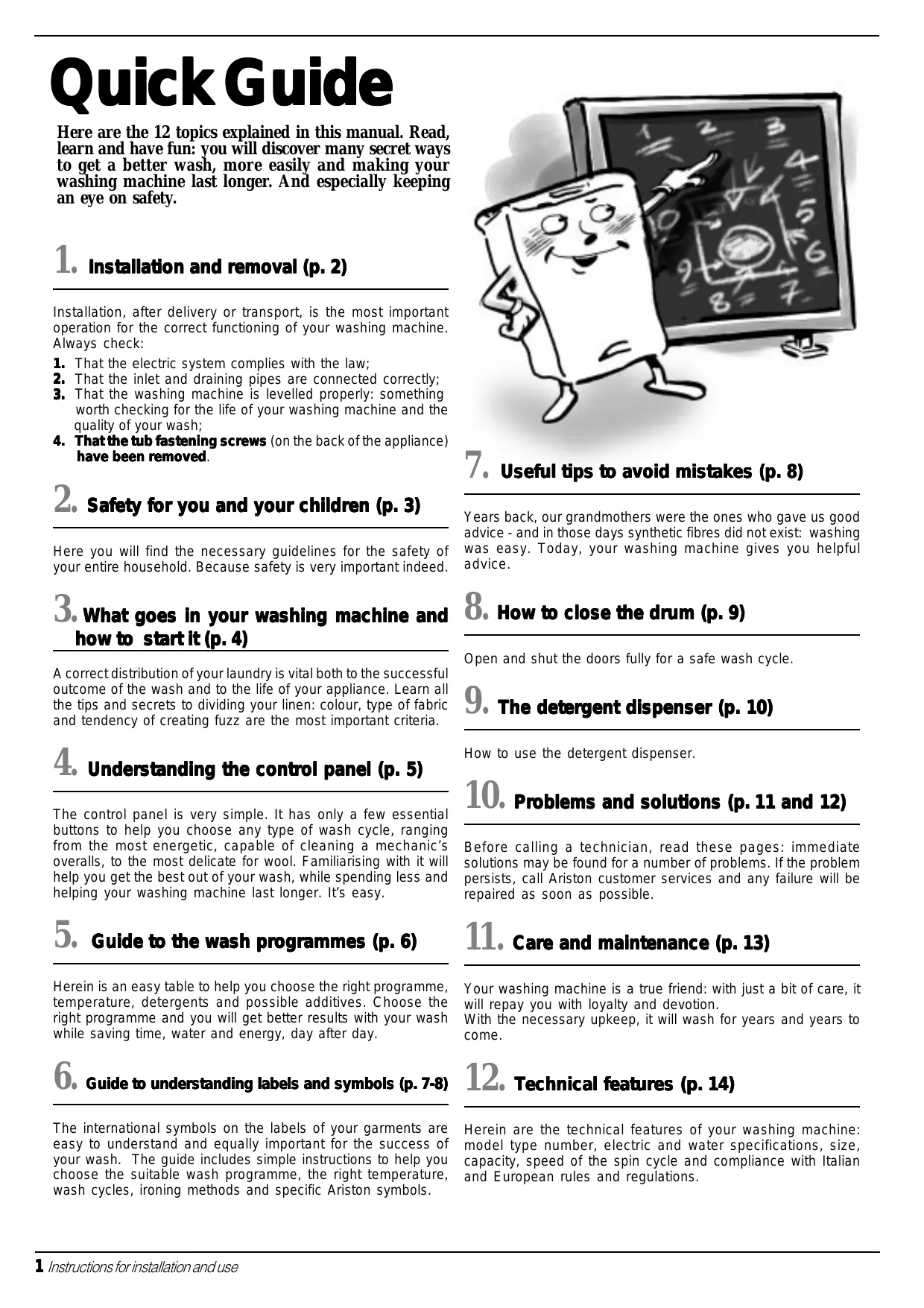 Quick Guide Here are the 12 topics explained in this manual. Read, learn and have fun: you will discover many secret ways to get a better wash, more easily and making your washing machine last longer. And especially keeping an eye on safety.