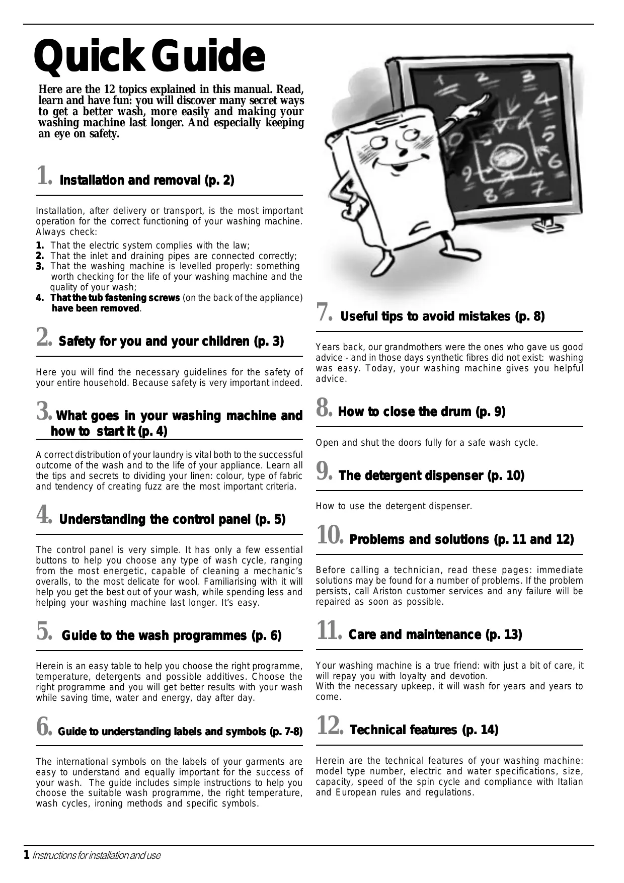 Here are the 12 topics explained in this manual. Read, learn and have fun: you will discover many secret ways to get a better wash, more easily and making your washing machine last longer. And especially keeping an eye on safety.