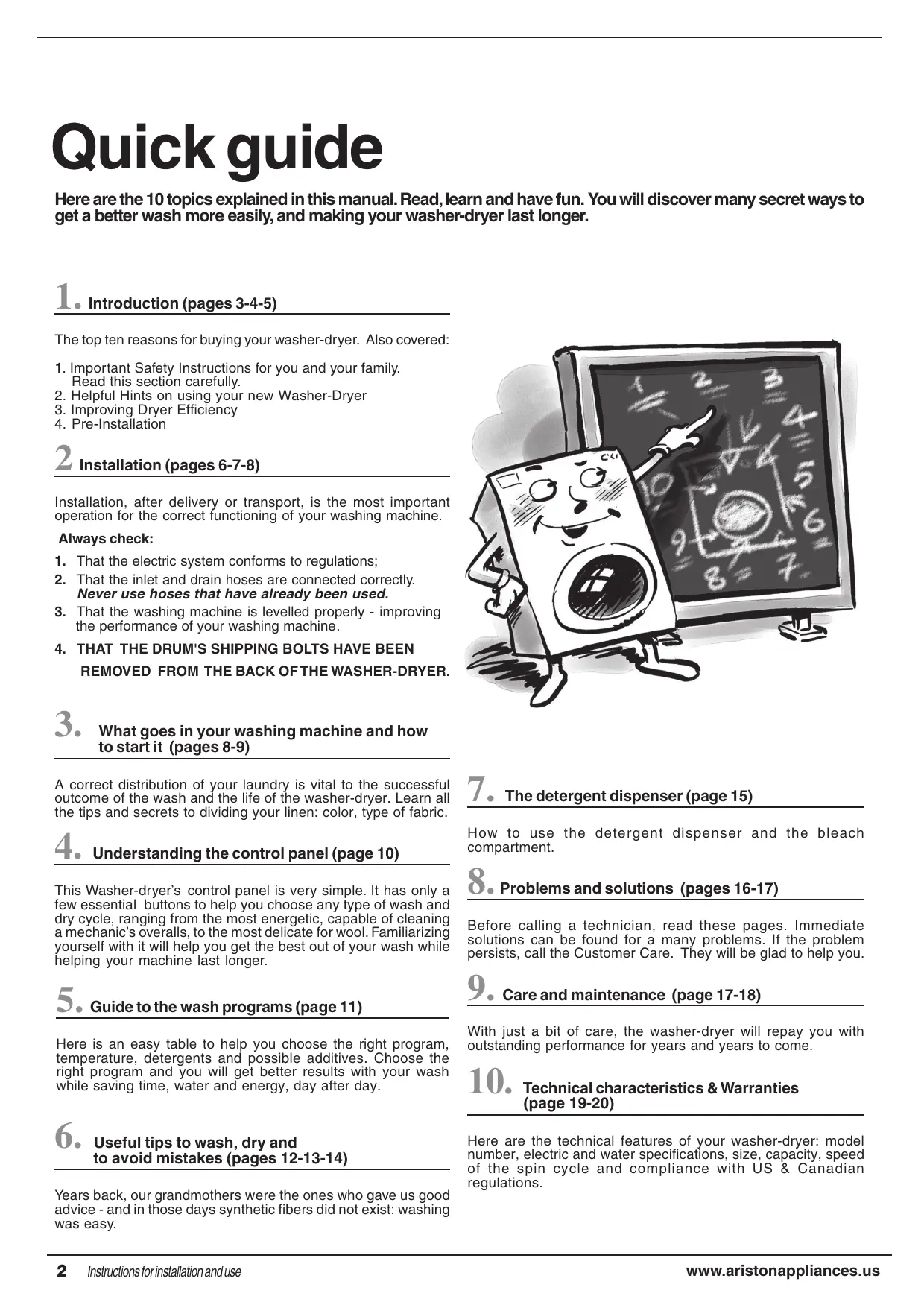 Here are the 10 topics explained in this manual. Read, learn and have fun. You will discover many secret ways to get a better wash more easily, and making your washer-dryer last longer.