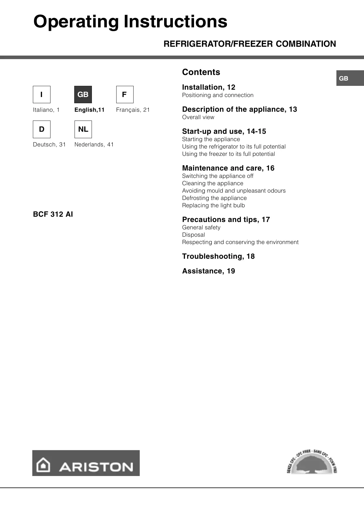 Download the instructions for your Fridge Freezer in PDF format for free! Find your manual BCF 312 AI - HOTPOINT and take your electronic device back in hand. On this page are published all the documents necessary for the use of your device. BCF 312 AI by HOTPOINT.
