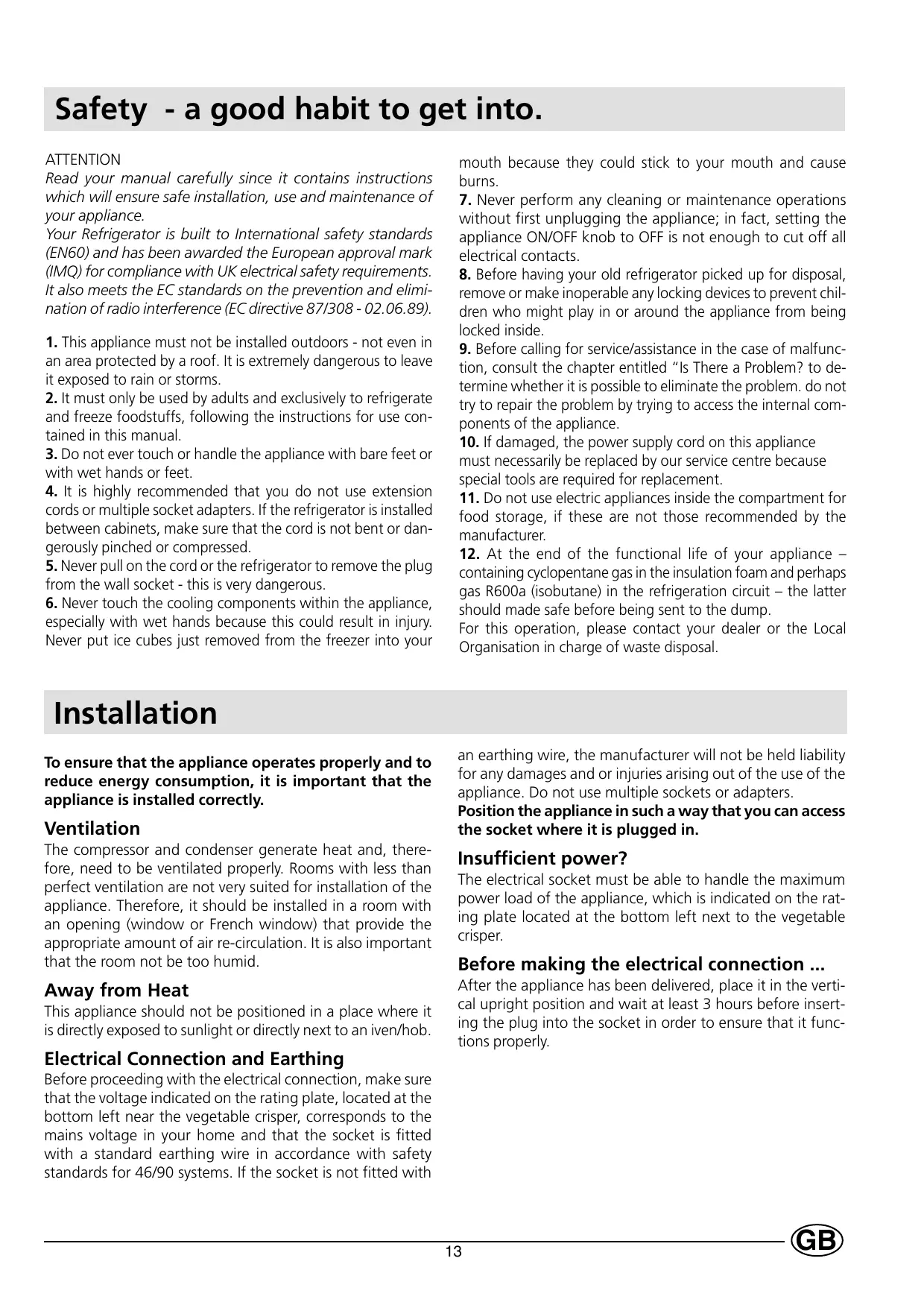MAX WATER LEVEL WATER LEVEL MAX Safety - a good habit to get into. ATTENTION Read your manual carefully since it contains instructions which will ensure safe installation, use and maintenance of your appliance. Your Refrigerator is built to International safety standards (EN60) and has been awarded the European approval mark (IMQ) for compliance with UK electrical safety requirements. It also meets the EC standards on the prevention and elimination of radio interference (EC directive 87/308 - 02.06.89).