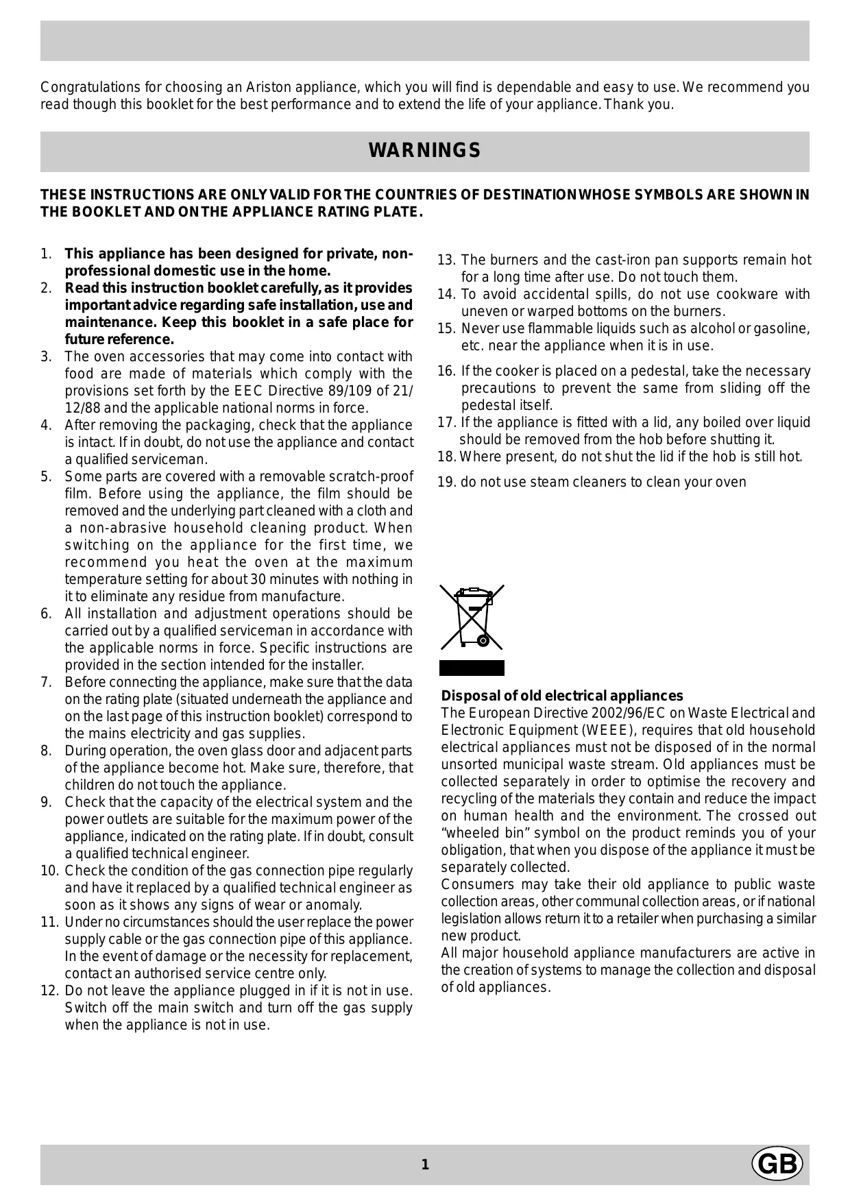 WARNINGS THESE INSTRUCTIONS ARE ONLY VALID FOR THE COUNTRIES OF DESTINATION WHOSE SYMBOLS ARE SHOWN IN THE BOOKLET AND ON THE APPLIANCE RATING PLATE. 1. This appliance has been designed for private, nonprofessional domestic use in the home. 2. Read this instruction booklet carefully, as it provides important advice regarding safe installation, use and maintenance. Keep this booklet in a safe place for future reference. 3. The oven accessories that may come into contact with food are made of materials which comply with the provisions set forth by the EEC Directive 89/109 of 21/ 12/88 and the applicable national norms in force. 4. After removing the packaging, check that the appliance is intact. If in doubt, do not use the appliance and contact a qualified serviceman. 5. Some parts are covered with a removable scratch-proof film. Before using the appliance, the film should be removed and the underlying part cleaned with a cloth and a non-abrasive household cleaning product. When switching on the appliance for the first time, we recommend you heat the oven at the maximum temperature setting for about 30 minutes with nothing in it to eliminate any residue from manufacture. 6. All installation and adjustment operations should be carried out by a qualified serviceman in accordance with the applicable norms in force. Specific instructions are provided in the section intended for the installer. 7. Before connecting the appliance, make sure that the data on the rating plate (situated underneath the appliance and on the last page of this instruction booklet) correspond to the mains electricity and gas supplies. 8. During operation, the oven glass door and adjacent parts of the appliance become hot. Make sure, therefore, that children do not touch the appliance. 9. Check that the capacity of the electrical system and the power outlets are suitable for the maximum power of the appliance, indicated on the rating plate. If in doubt, consult a qualified technical engineer. 10. Check the condition of the gas connection pipe regularly and have it replaced by a qualified technical engineer as soon as it shows any signs of wear or anomaly. 11. Under no circumstances should the user replace the power supply cable or the gas connection pipe of this appliance. In the event of damage or the necessity for replacement, contact an authorised service centre only. 12. Do not leave the appliance plugged in if it is not in use. Switch off the main switch and turn off the gas supply when the appliance is not in use.