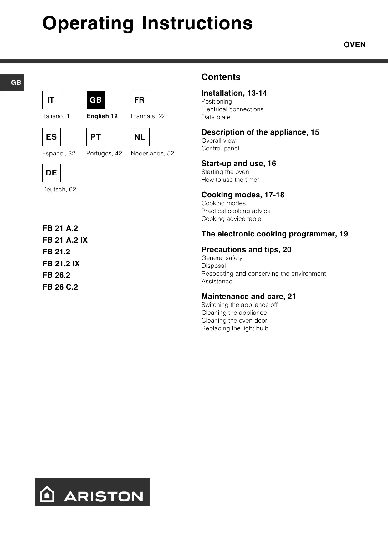 Download the instructions for your Oven in PDF format for free! Find your manual FB 26.2 - HOTPOINT and take your electronic device back in hand. On this page are published all the documents necessary for the use of your device. FB 26.2 by HOTPOINT.