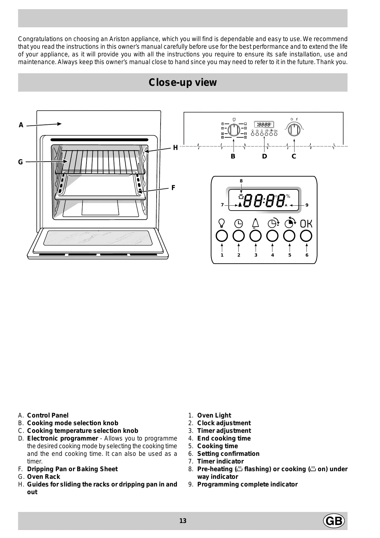 Congratulations on choosing an Ariston appliance, which you will find is dependable and easy to use. We recommend that you read the instructions in this owner’s manual carefully before use for the best performance and to extend the life of your appliance, as it will provide you with all the instructions you require to ensure its safe installation, use and maintenance. Always keep this owner’s manual close to hand since you may need to refer to it in the future. Thank you. Close-up view