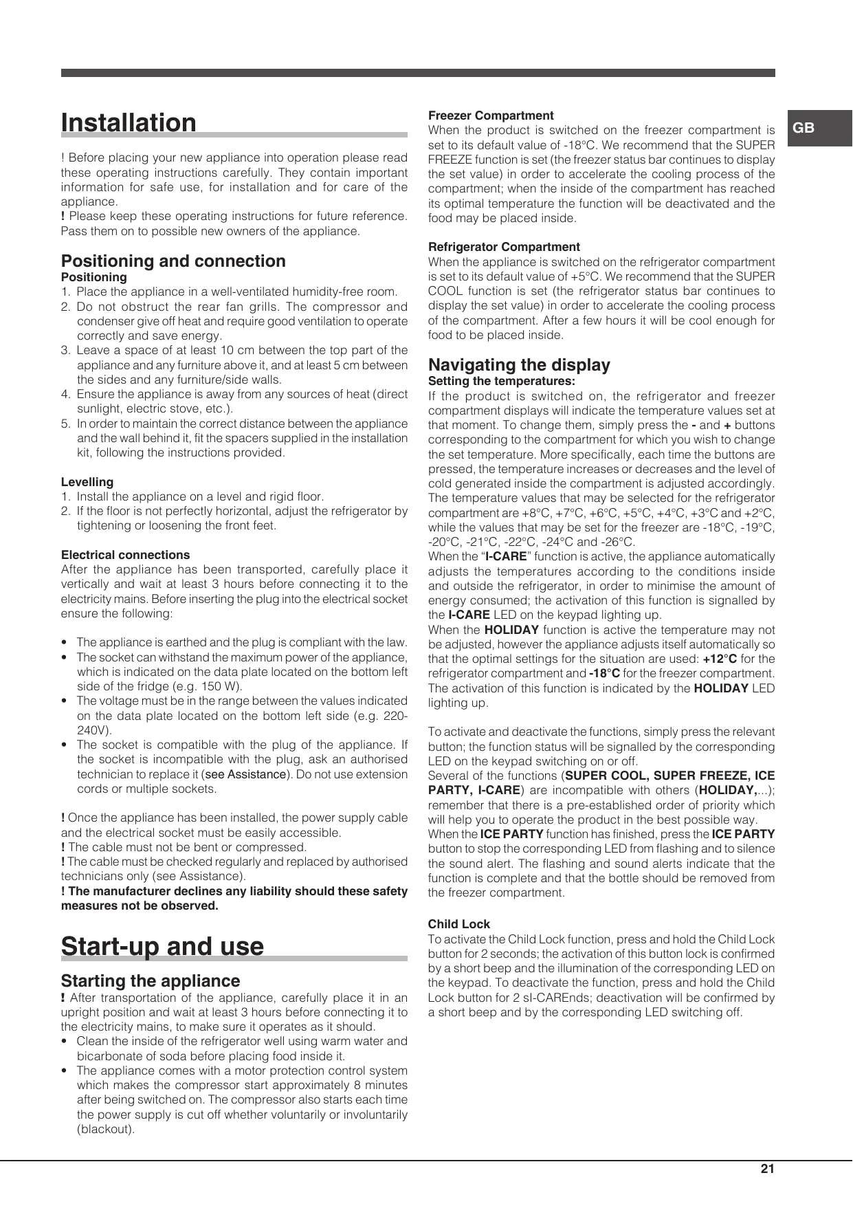 - The appliance comes with a motor protection control system which makes the compressor start approximately 8 minutes after being switched on. The compressor also starts each time the power supply is cut off whether voluntarily or involuntarily (blackout). Freezer Compartment When the product is switched on the freezer compartment is set to its default value of -18°C. We recommend that the SUPER FREEZE function is set (the freezer status bar continues to display the set value) in order to accelerate the cooling process of the compartment; when the inside of the compartment has reached its optimal temperature the function will be deactivated and the food may be placed inside. Refrigerator Compartment When the appliance is switched on the refrigerator compartment is set to its default value of +5°C. We recommend that the SUPER COOL function is set (the refrigerator status bar continues to display the set value) in order to accelerate the cooling process of the compartment. After a few hours it will be cool enough for food to be placed inside. Navigating the display Setting the temperatures: If the product is switched on, the refrigerator and freezer compartment displays will indicate the temperature values set at that moment. To change them, simply press the - and + buttons corresponding to the compartment for which you wish to change the set temperature. More specifically, each time the buttons are pressed, the temperature increases or decreases and the level of cold generated inside the compartment is adjusted accordingly. The temperature values that may be selected for the refrigerator compartment are +8°C, +7°C, +6°C, +5°C, +4°C, +3°C and +2°C, while the values that may be set for the freezer are -18°C, -19°C, -20°C, -21°C, -22°C, -24°C and -26°C. When the “I-CARE” function is active, the appliance automatically adjusts the temperatures according to the conditions inside and outside the refrigerator, in order to minimise the amount of energy consumed; the activation of this function is signalled by the I-CARE LED on the keypad lighting up. When the HOLIDAY function is active the temperature may not be adjusted, however the appliance adjusts itself automatically so that the optimal settings for the situation are used: +12°C for the refrigerator compartment and -18°C for the freezer compartment. The activation of this function is indicated by the HOLIDAY LED lighting up. To activate and deactivate the functions, simply press the relevant button; the function status will be signalled by the corresponding LED on the keypad switching on or off. Several of the functions (SUPER COOL, SUPER FREEZE, ICE PARTY, I-CARE) are incompatible with others (HOLIDAY,...); remember that there is a pre-established order of priority which will help you to operate the product in the best possible way. When the ICE PARTY function has finished, press the ICE PARTY button to stop the corresponding LED from flashing and to silence the sound alert. The flashing and sound alerts indicate that the function is complete and that the bottle should be removed from the freezer compartment. Child Lock To activate the Child Lock function, press and hold the Child Lock button for 2 seconds; the activation of this button lock is confirmed by a short beep and the illumination of the corresponding LED on the keypad. To deactivate the function, press and hold the Child Lock button for 2 sI-CAREnds; deactivation will be confirmed by a short beep and by the corresponding LED switching off.