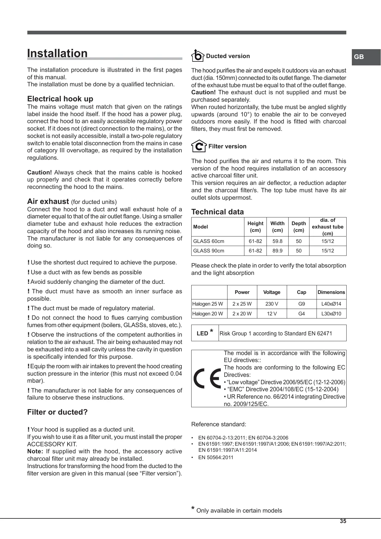 - UR Reference no. 66/2014 integrating Directive no. 2009/125/EC. ! Equip the room with air intakes to prevent the hood creating suction pressure in the interior (this must not exceed 0.04 mbar). ! The manufacturer is not liable for any consequences of failure to observe these instructions. Filter or ducted? ! Your hood is supplied as a ducted unit. If you wish to use it as a filter unit, you must install the proper ACCESSORY KIT. Note: If supplied with the hood, the accessory active charcoal filter unit may already be installed. Instructions for transforming the hood from the ducted to the filter version are given in this manual (see “Filter version”). Reference standard: