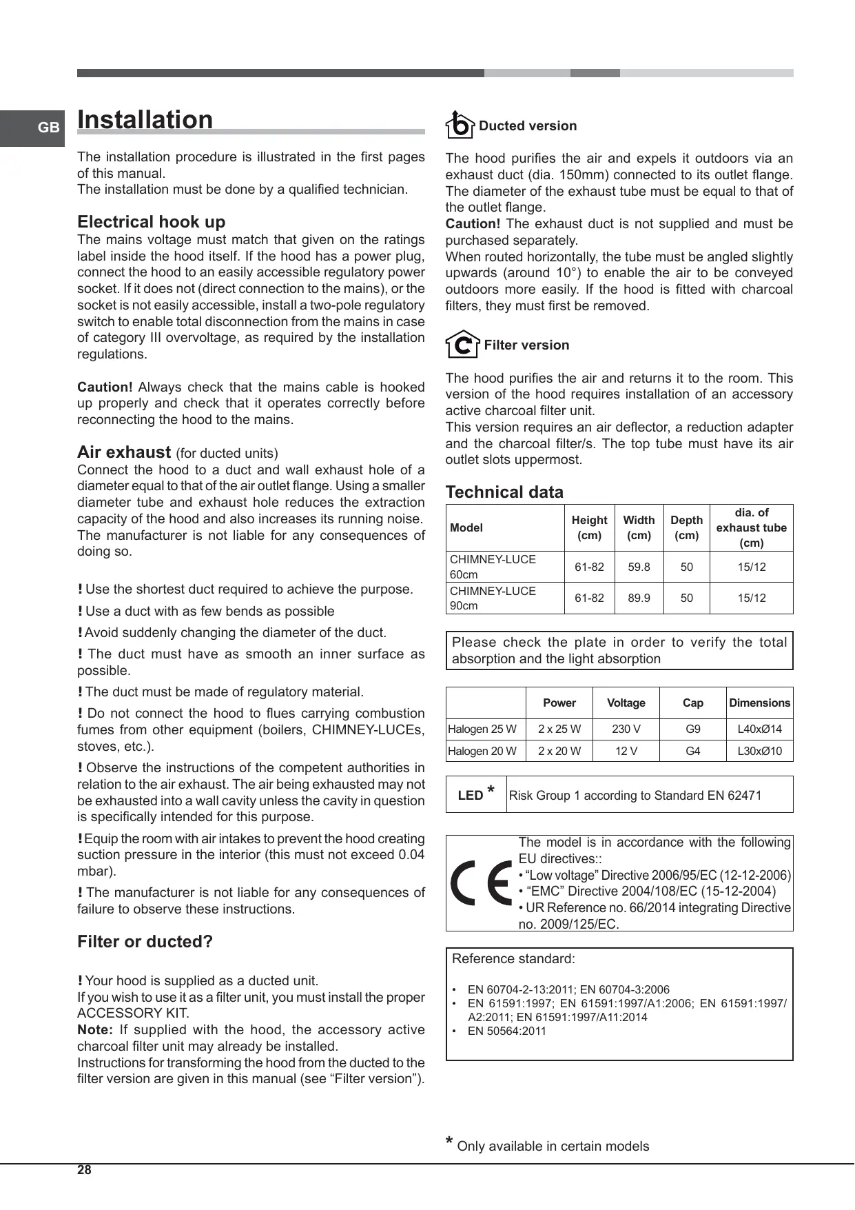 Instructions for transforming the hood from the ducted to the filter version are given in this manual (see “Filter version”).