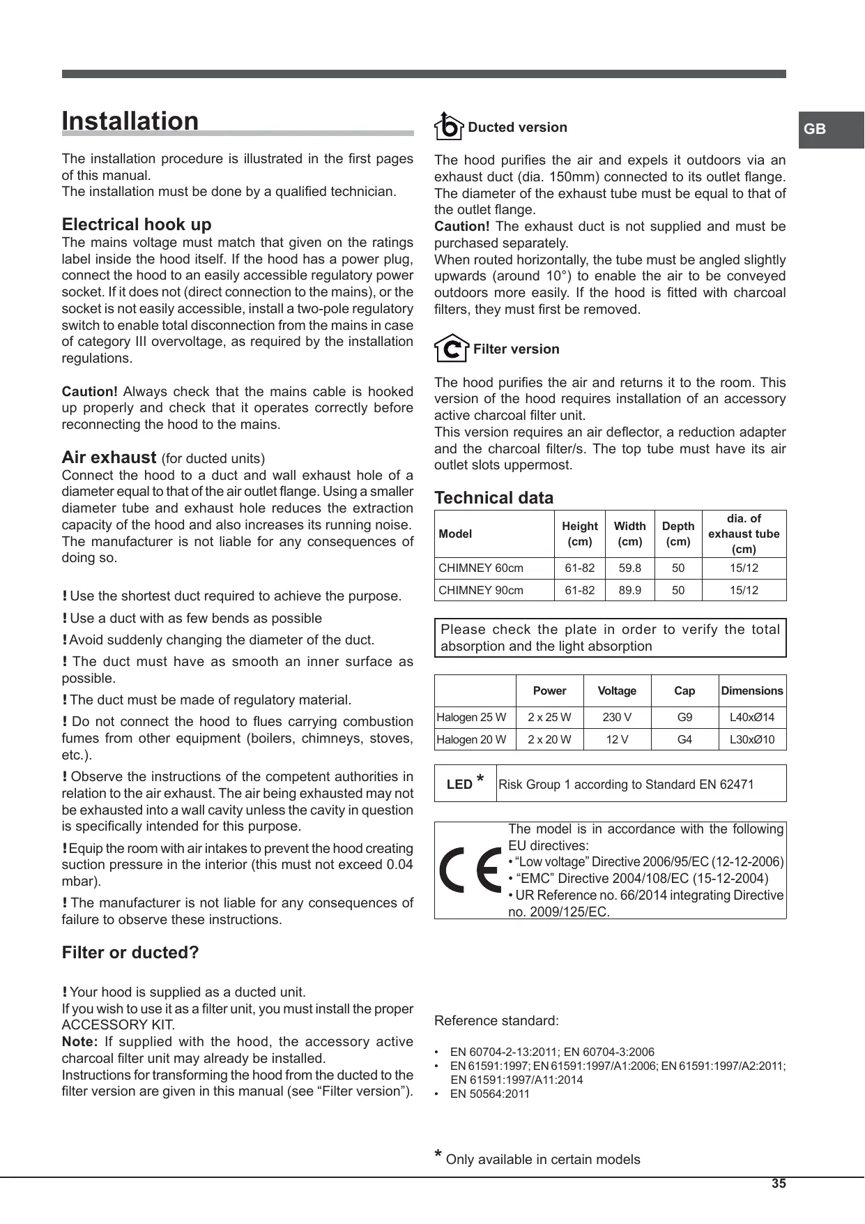 - UR Reference no. 66/2014 integrating Directive no. 2009/125/EC. ! Equip the room with air intakes to prevent the hood creating suction pressure in the interior (this must not exceed 0.04 mbar). ! The manufacturer is not liable for any consequences of failure to observe these instructions. Filter or ducted? ! Your hood is supplied as a ducted unit. If you wish to use it as a filter unit, you must install the proper ACCESSORY KIT. Note: If supplied with the hood, the accessory active charcoal filter unit may already be installed. Instructions for transforming the hood from the ducted to the filter version are given in this manual (see “Filter version”). Reference standard: