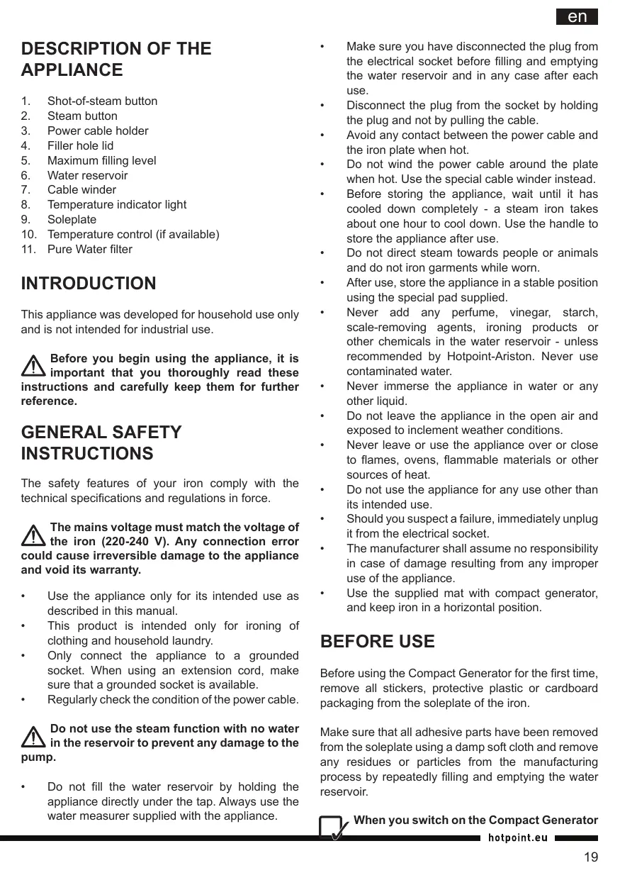 Never add any perfume, vinegar, starch, scale-removing agents, ironing products or other chemicals in the water reservoir - unless recommended by Hotpoint-Ariston. Never use contaminated water.