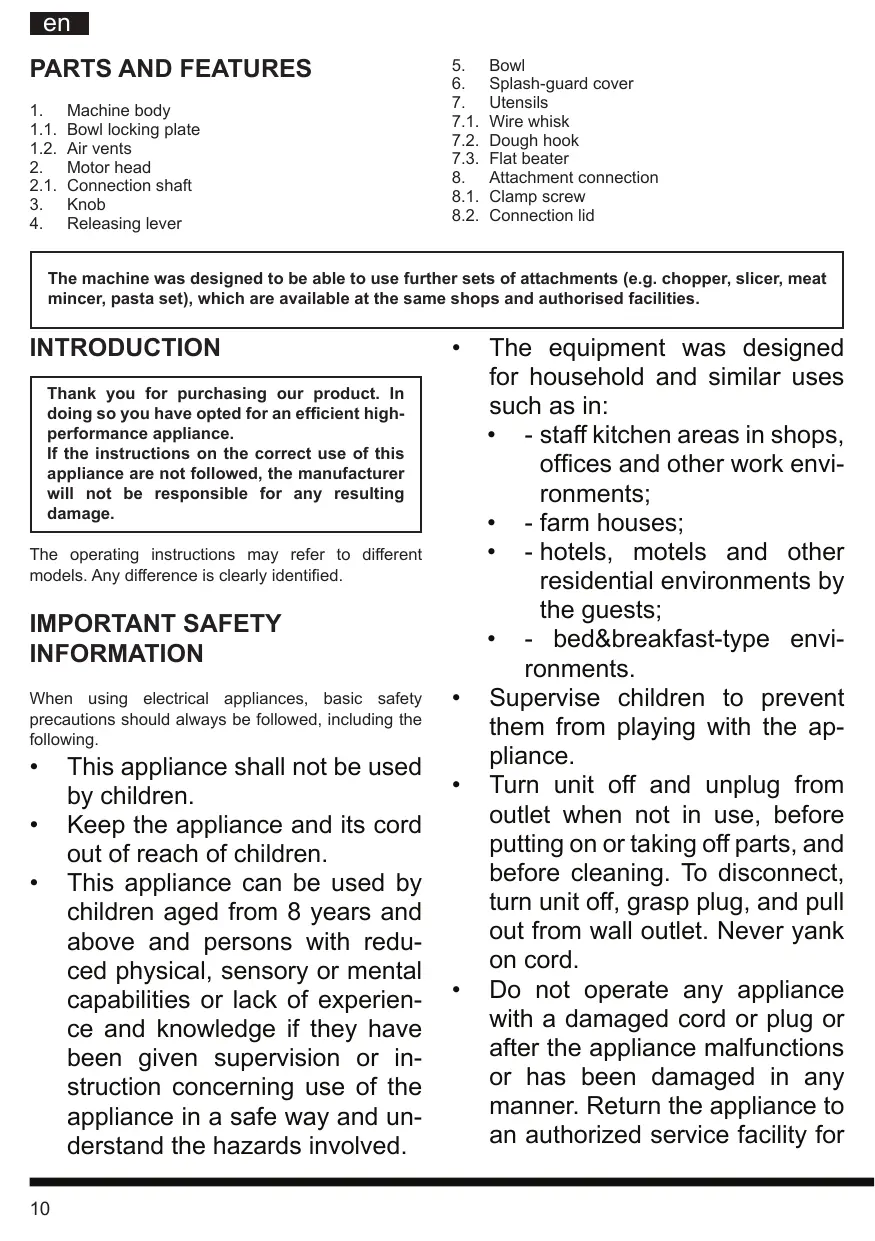 | Normal to hard mixtures: · Biscuits · Pastry · Cakes · Meat balls · Stuffing · Mashed potatoes · Icing | |