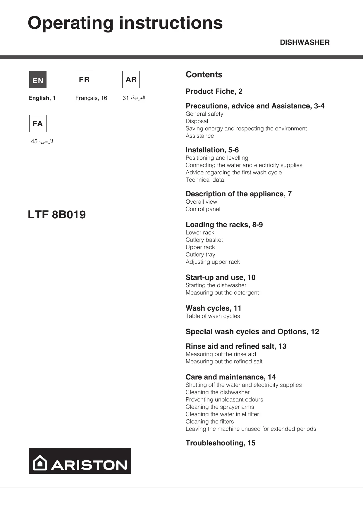 31 ،العربية Contents Product Fiche, 2 Precautions, advice and Assistance, 3-4 General safety Disposal Saving energy and respecting the environment Assistance Installation, 5-6 Positioning and levelling Connecting the water and electricity supplies Advice regarding the first wash cycle Technical data Description of the appliance, 7 LTF 8B019 Overall view Control panel Loading the racks, 8-9 Lower rack Cutlery basket Upper rack Cutlery tray Adjusting upper rack Start-up and use, 10 Starting the dishwasher Measuring out the detergent Wash cycles, 11 Table of wash cycles Special wash cycles and Options, 12 Rinse aid and refined salt, 13 Measuring out the rinse aid Measuring out the refined salt Care and maintenance, 14 Shutting off the water and electricity supplies Cleaning the dishwasher Preventing unpleasant odours Cleaning the sprayer arms Cleaning the water inlet filter Cleaning the filters Leaving the machine unused for extended periods Troubleshooting, 15 Product Fiche