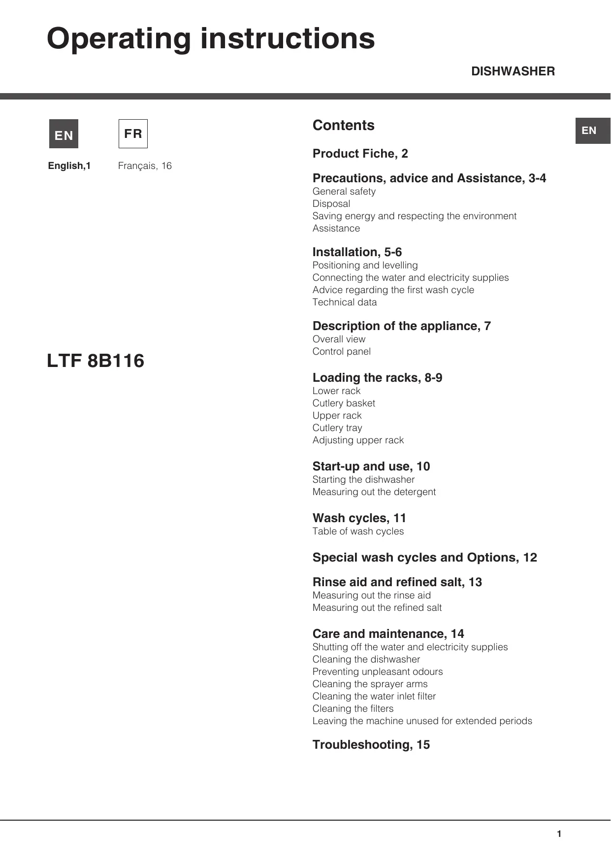 Product Fiche, 2 Precautions, advice and Assistance, 3-4 General safety Disposal Saving energy and respecting the environment Assistance Installation, 5-6 Positioning and levelling Connecting the water and electricity supplies Advice regarding the first wash cycle Technical data Description of the appliance, 7 LTF 8B116 Overall view Control panel Loading the racks, 8-9 Lower rack Cutlery basket Upper rack Cutlery tray Adjusting upper rack Start-up and use, 10 Starting the dishwasher Measuring out the detergent Wash cycles, 11 Table of wash cycles Special wash cycles and Options, 12 Rinse aid and refined salt, 13 Measuring out the rinse aid Measuring out the refined salt Care and maintenance, 14 Shutting off the water and electricity supplies Cleaning the dishwasher Preventing unpleasant odours Cleaning the sprayer arms Cleaning the water inlet filter Cleaning the filters Leaving the machine unused for extended periods Troubleshooting, 15