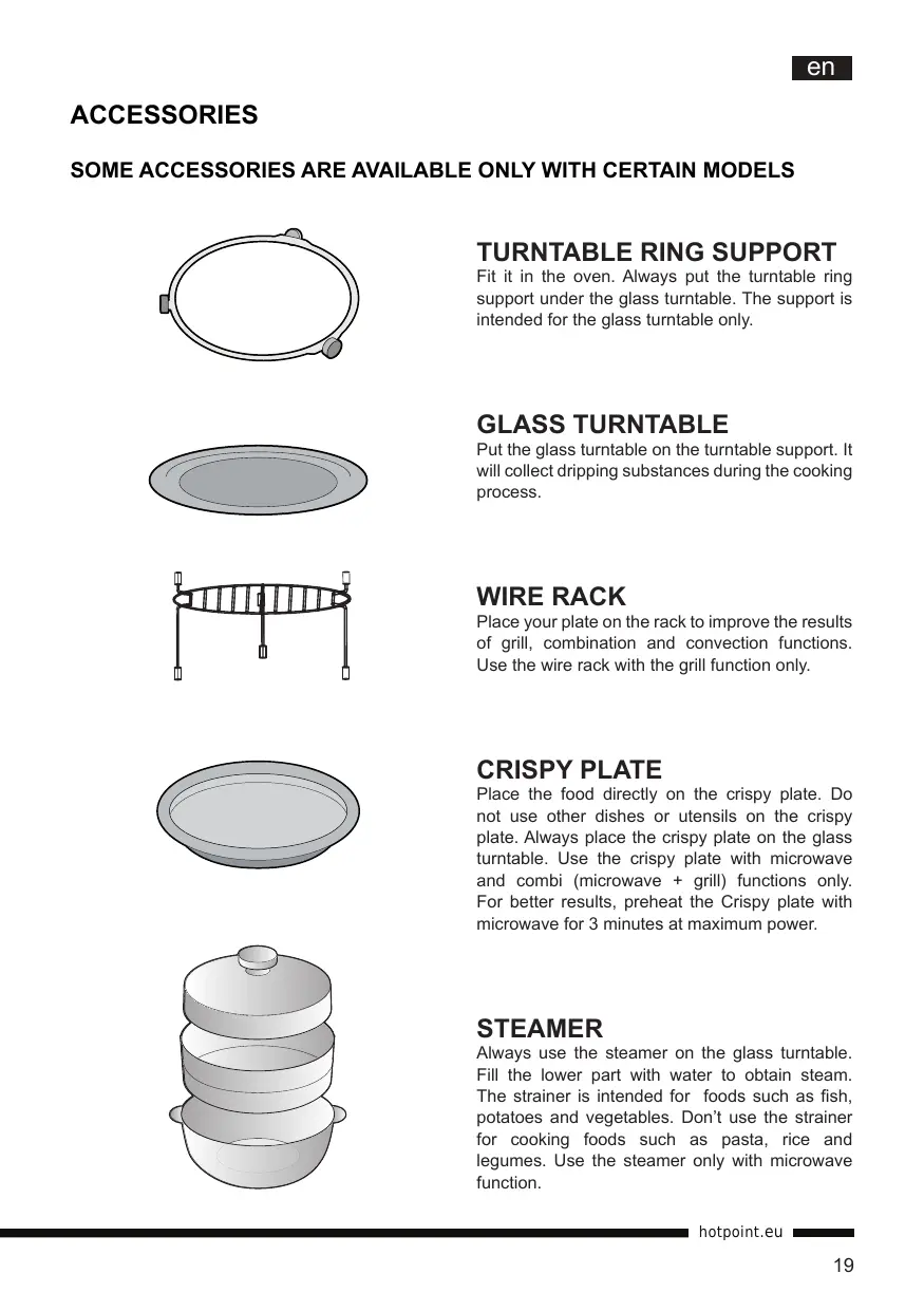 Fill the lower part with water to obtain steam. The strainer is intended for foods such as fish, potatoes and vegetables. Don’t use the strainer for cooking foods such as pasta, rice and legumes. Use the steamer only with microwave function. hotpoint.eu