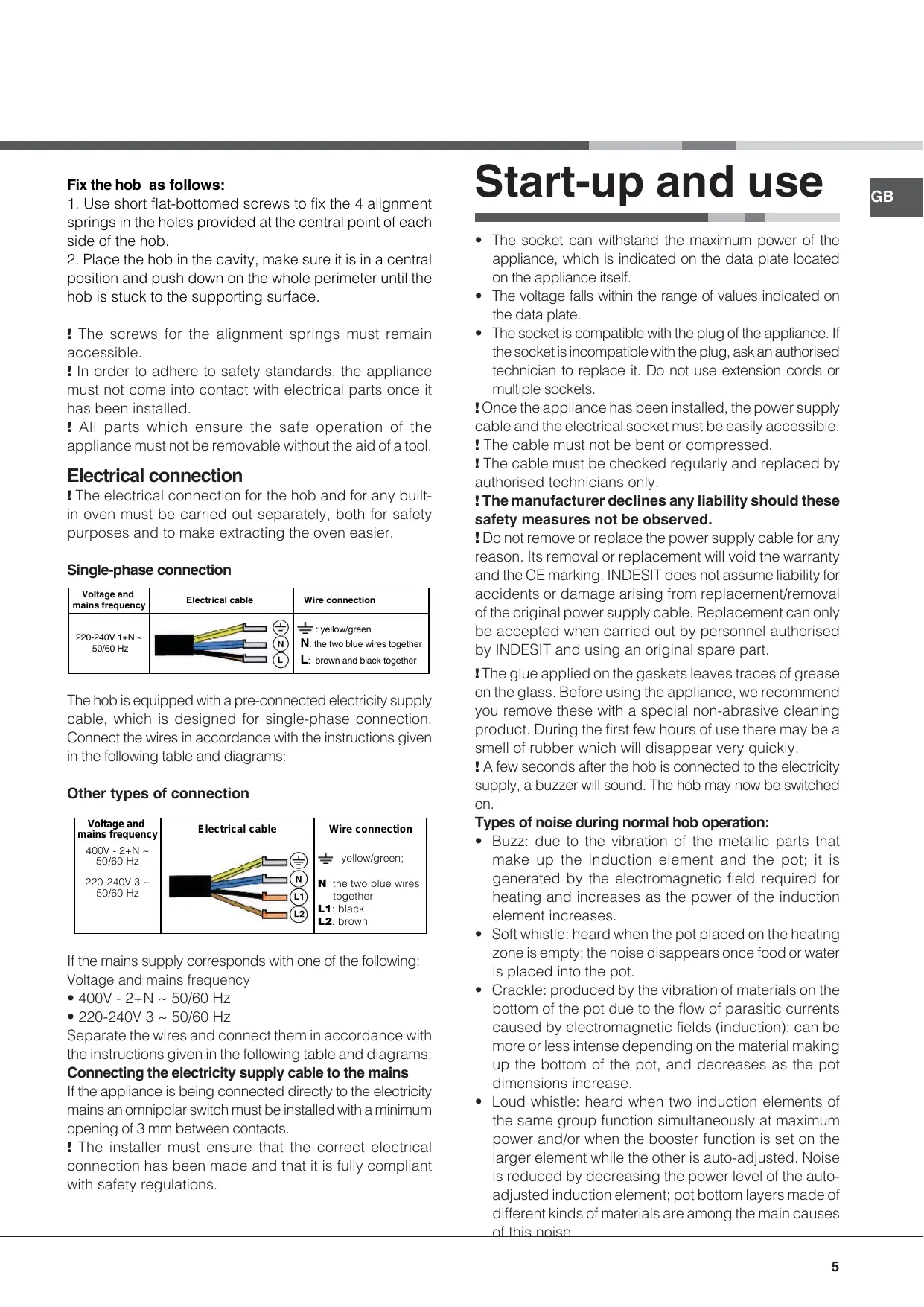 The hob is equipped with a pre-connected electricity supply cable, which is designed for single-phase connection. Connect the wires in accordance with the instructions given in the following table and diagrams: Other types of connection Voltage and mains frequency