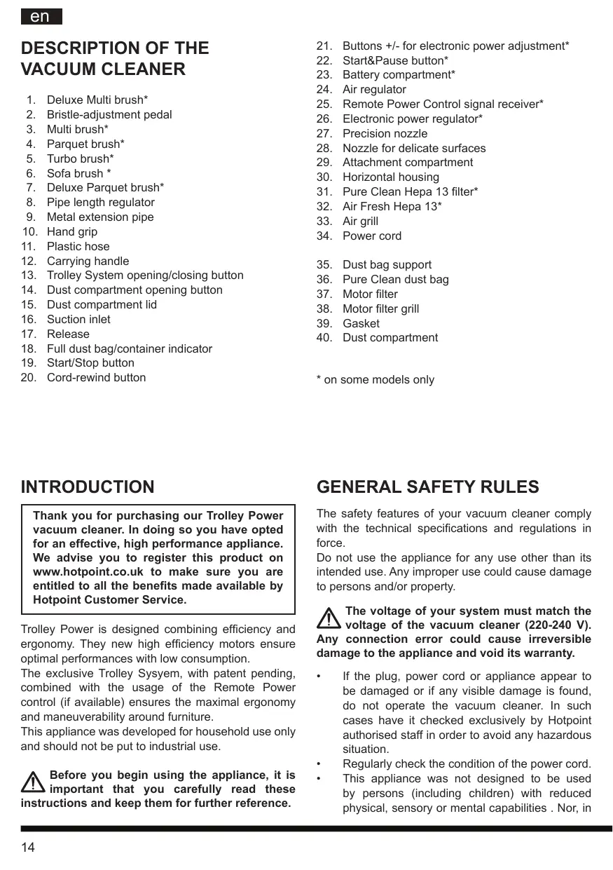 Deluxe Multi brush* Bristle-adjustment pedal Multi brush* Parquet brush* Turbo brush* Sofa brush * Deluxe Parquet brush* Pipe length regulator Metal extension pipe Hand grip Plastic hose Carrying handle Trolley System opening/closing button Dust compartment opening button Dust compartment lid Suction inlet Release Full dust bag/container indicator Start/Stop button Cord-rewind button INTRODUCTION Thank you for purchasing our Trolley Power vacuum cleaner. In doing so you have opted for an effective, high performance appliance. We advise you to register this product on www.hotpoint.co.uk to make sure you are entitled to all the benefits made available by Hotpoint Customer Service. Trolley Power is designed combining efficiency and ergonomy. They new high efficiency motors ensure optimal performances with low consumption. The exclusive Trolley Sysyem, with patent pending, combined with the usage of the Remote Power control (if available) ensures the maximal ergonomy and maneuverability around furniture. This appliance was developed for household use only and should not be put to industrial use. Before you begin using the appliance, it is important that you carefully read these instructions and keep them for further reference.