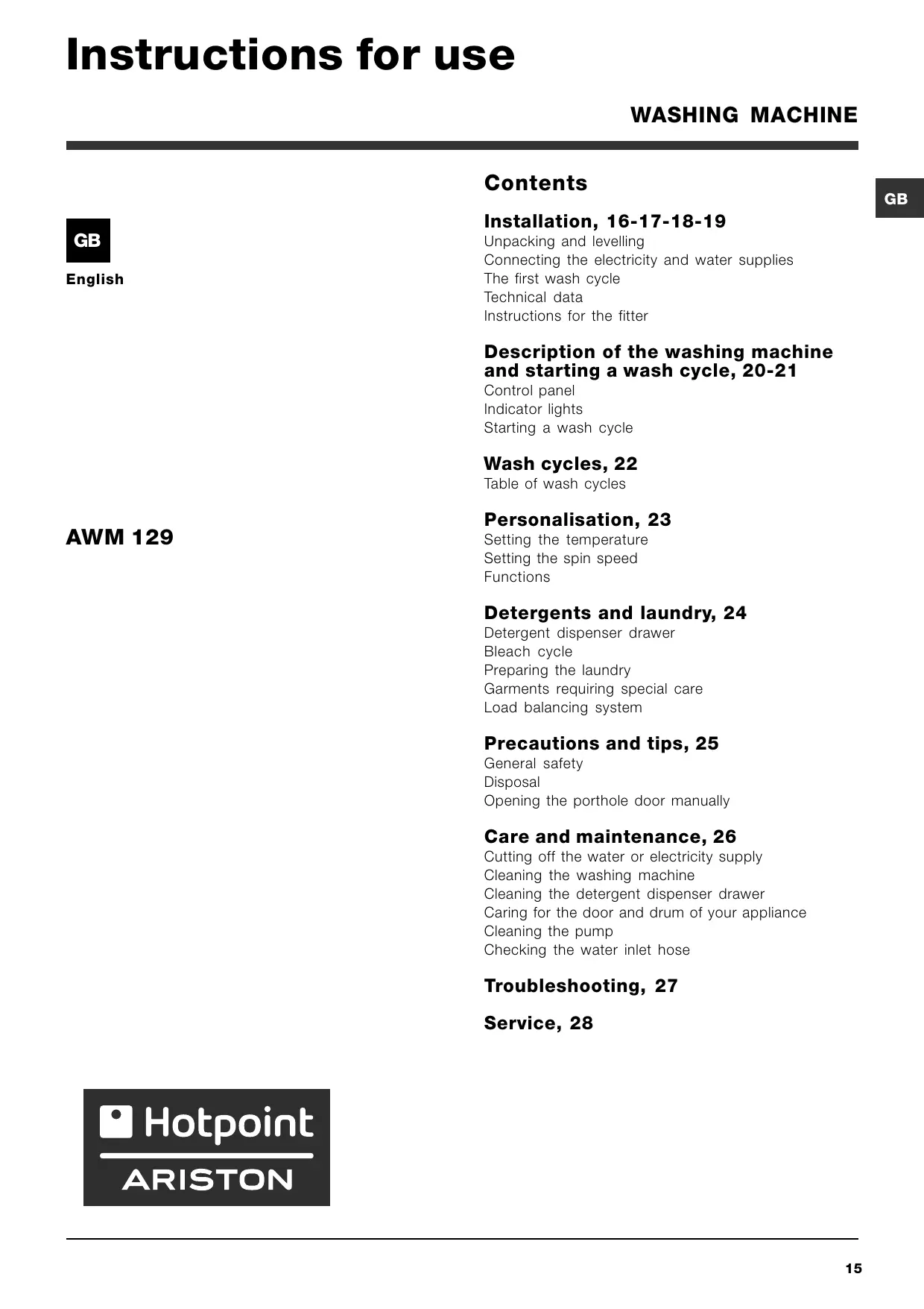 Find the device manual for free AWM 129 HOTPOINT in PDF.