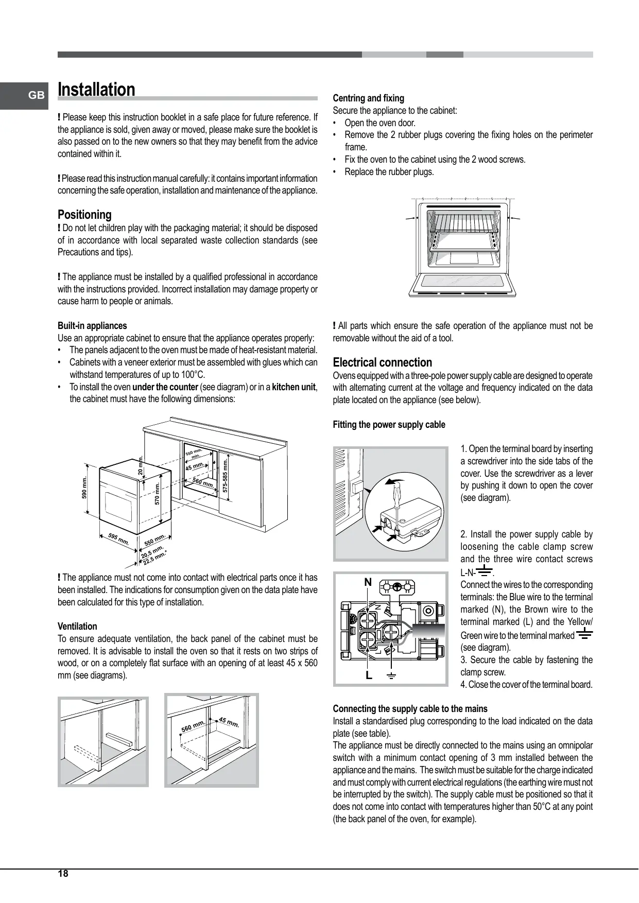Ventilation To ensure adequate ventilation, the back panel of the cabinet must be removed. It is advisable to install the oven so that it rests on two strips of wood, or on a completely flat surface with an opening of at least 45 x 560 mm (see diagrams).