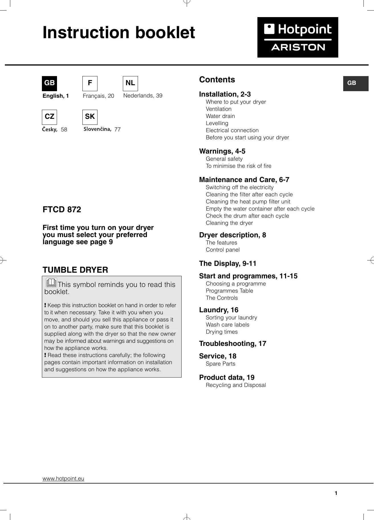 TUMBLE DRYER This symbol reminds you to read this booklet.