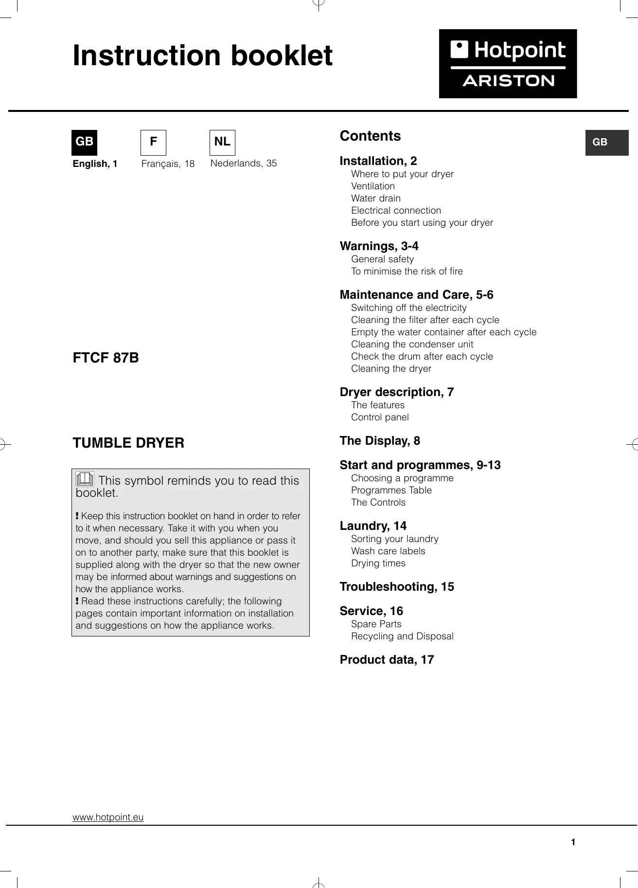 Find the device manual for free FTCF 87B 6HY HOTPOINT in PDF.