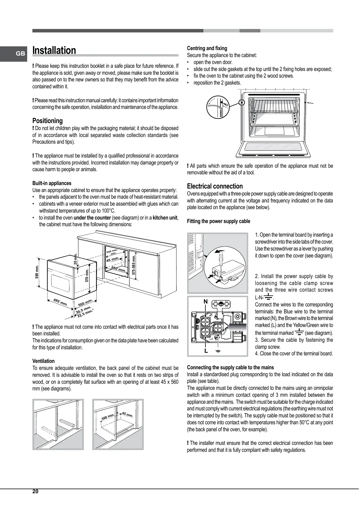Electrical connection ! The appliance must not come into contact with electrical parts once it has been installed. The indications for consumption given on the data plate have been calculated for this type of installation. Ventilation To ensure adequate ventilation, the back panel of the cabinet must be removed. It is advisable to install the oven so that it rests on two strips of wood, or on a completely flat surface with an opening of at least 45 x 560 mm (see diagrams).