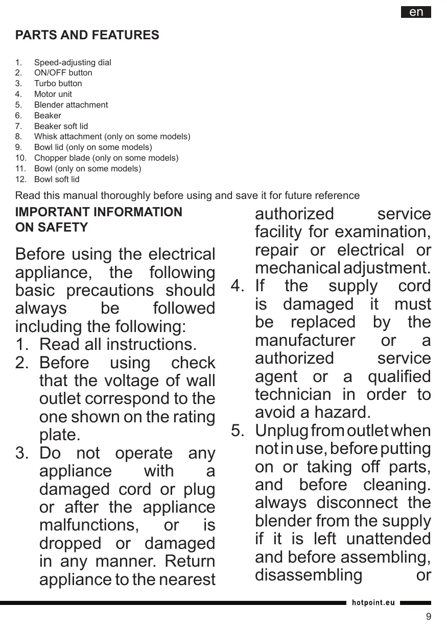 appliance with a damaged cord or plug or after the appliance malfunctions, or is dropped or damaged in any manner. Return appliance to the nearest authorized service facility for examination, repair or electrical or mechanical adjustment. If the supply cord is damaged it must be replaced by the manufacturer or a authorized service agent or a qualified technician in order to avoid a hazard. Unplugfromoutletwhen notinuse, before putting on or taking off parts, and before cleaning. always disconnect the blender from the supply if it is left unattended and before assembling, disassembling or hotpoint.eu =