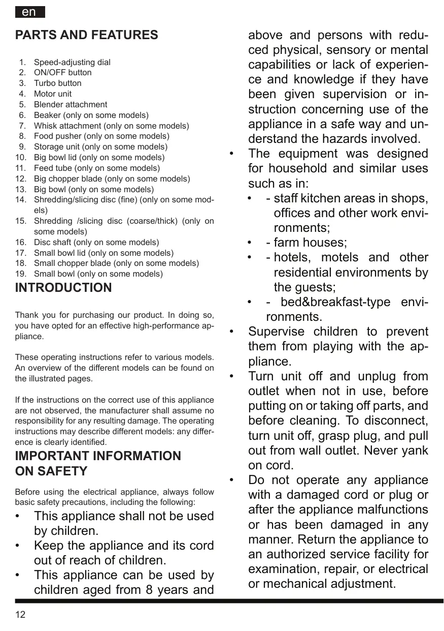 If the instructions on the correct use of this appliance are not observed, the manufacturer shall assume no responsibility for any resulting damage. The operating instructions may describe different models: any difference is clearly identified. IMPORTANT INFORMATION ON SAFETY Before using the electrical appliance, always follow basic safety precautions, including the following: