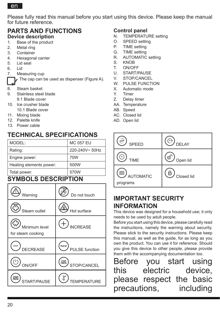 and food overflow. NEVER use the device without the dispenser cap in the lid with the pulse function or speeds higher than 5, because the hot parts could be splashed at the user or the surrounding environment. NEVER use the mixing blade with the pulse function or speeds higher than 5. When the device is working, its surfaces can reach very high temperatures; please always use the suitable oven gloved to handle the container, the lid, the mixing blade, the jagged ice crusher blade, the stainless steel blade, the steam basket and the dispenser cap during use or after the product was used. During cooking, please pay attention to any splashes of hot food, to heat or steam which could come towards your face when opening the lid. When the device is used without lid, the device can be compared to any standard pot: very hot liquids are easily accessible. Please always check the food temperature of the cooked food before you eat it, or before a child eats it. Periodically check the integrity of the lid seal. Should this be worn out, please contact an authorised service centre. Please replace it at least every two years. Before you close the lid, please check the seal is intact as well as correctly positioned. When you put the hexagonal insert back into place, please check that the seal is there and that it is intact too. ATTENTION! RISK OF DAMAGE TO PRODUCTS OR THINGS NEARBY DO NOT put the container in the oven, in the microwave oven or in the freezer. DO NOT place the device next to heat sources or in hot areas. DO NOT obstruct air outlets and make sure there is an adequate ventilation around the device when it is working. DO NOT expose the device to wet conditions or to the action of weather agents. NEVER make the device work without food inside. DO NOT use the jagged ice crusher blade, the stainless steal blade and the mixing blade to process hard ingredients in block which are bigger than 1,5 cm per side. Please make sure there is enough free space above the device and around it, in order to prevent any damages caused by the head produced by the device.