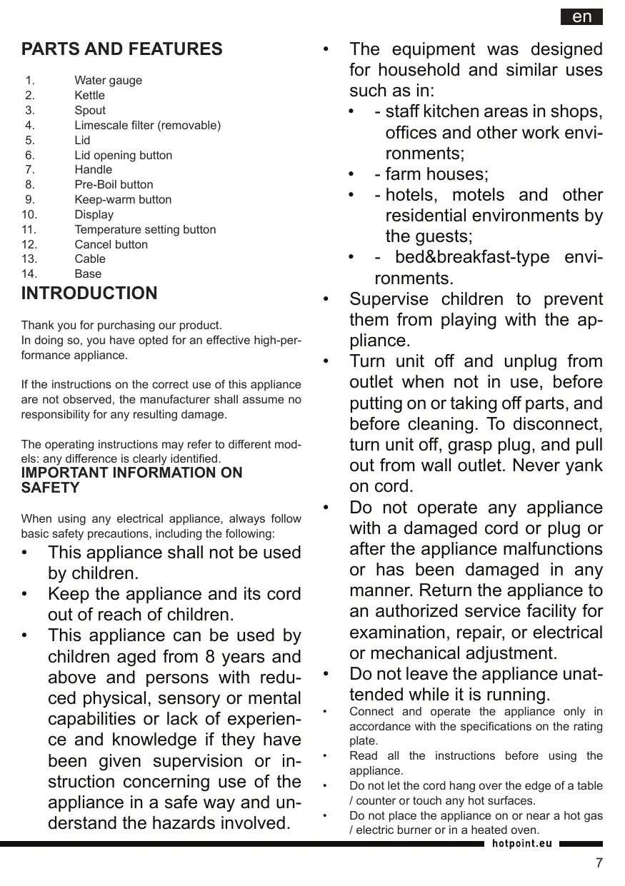 WK 24E AB0 - Electric kettle HOTPOINT - Free user manual and instructions