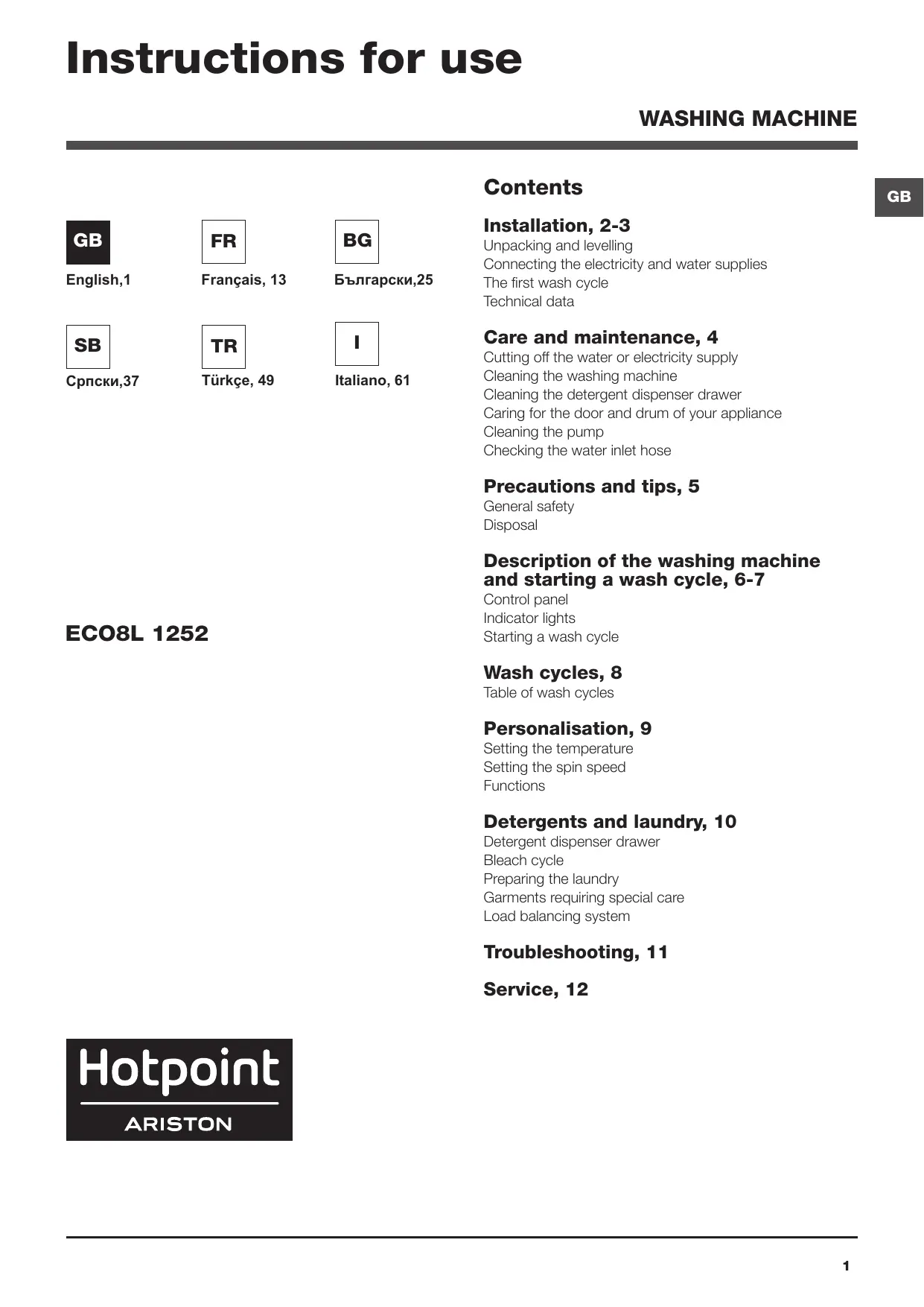 Download the instructions for your Washing machine in PDF format for free! Find your manual ECO8L 1252 EU.M - HOTPOINT and take your electronic device back in hand. On this page are published all the documents necessary for the use of your device. ECO8L 1252 EU.M by HOTPOINT.