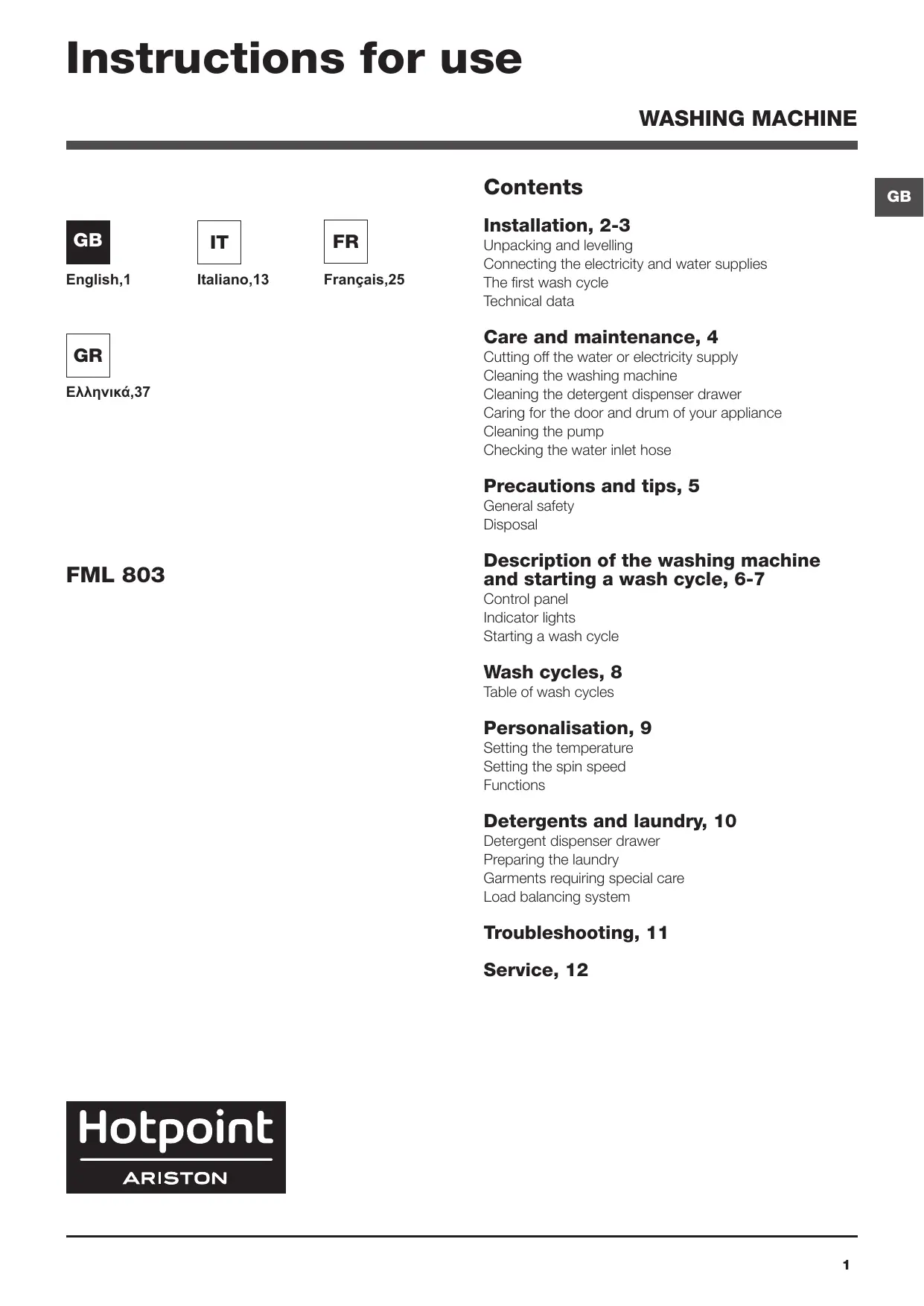 FML 803 EU.M - Washing machine HOTPOINT - Free user manual and instructions