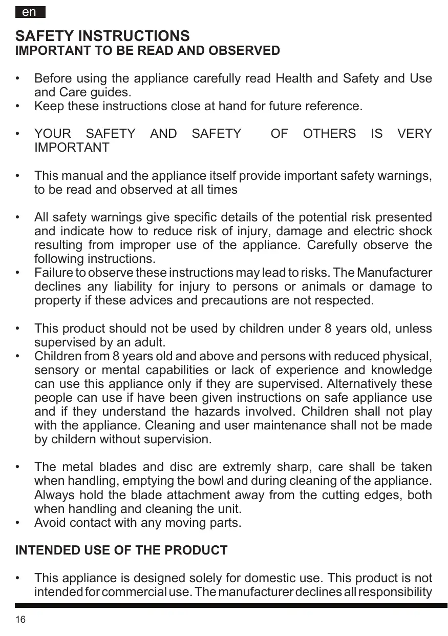 VERY This product should not be used by children under 8 years old, unless supervised by an adult. Children from 8 years old and above and persons with reduced physical, sensory or mental capabilities or lack of experience and knowledge can use this appliance only if they are supervised. Alternatively these people can use if have been given instructions on safe appliance use and if they understand the hazards involved. Children shall not play with the appliance. Cleaning and user maintenance shall not be made by childern without supervision. The metal blades and disc are extremly sharp, care shall be taken when handling, emptying the bowl and during cleaning of the appliance. Always hold the blade attachment away from the cutting edges, both when handling and cleaning the unit. Avoid contact with any moving parts.