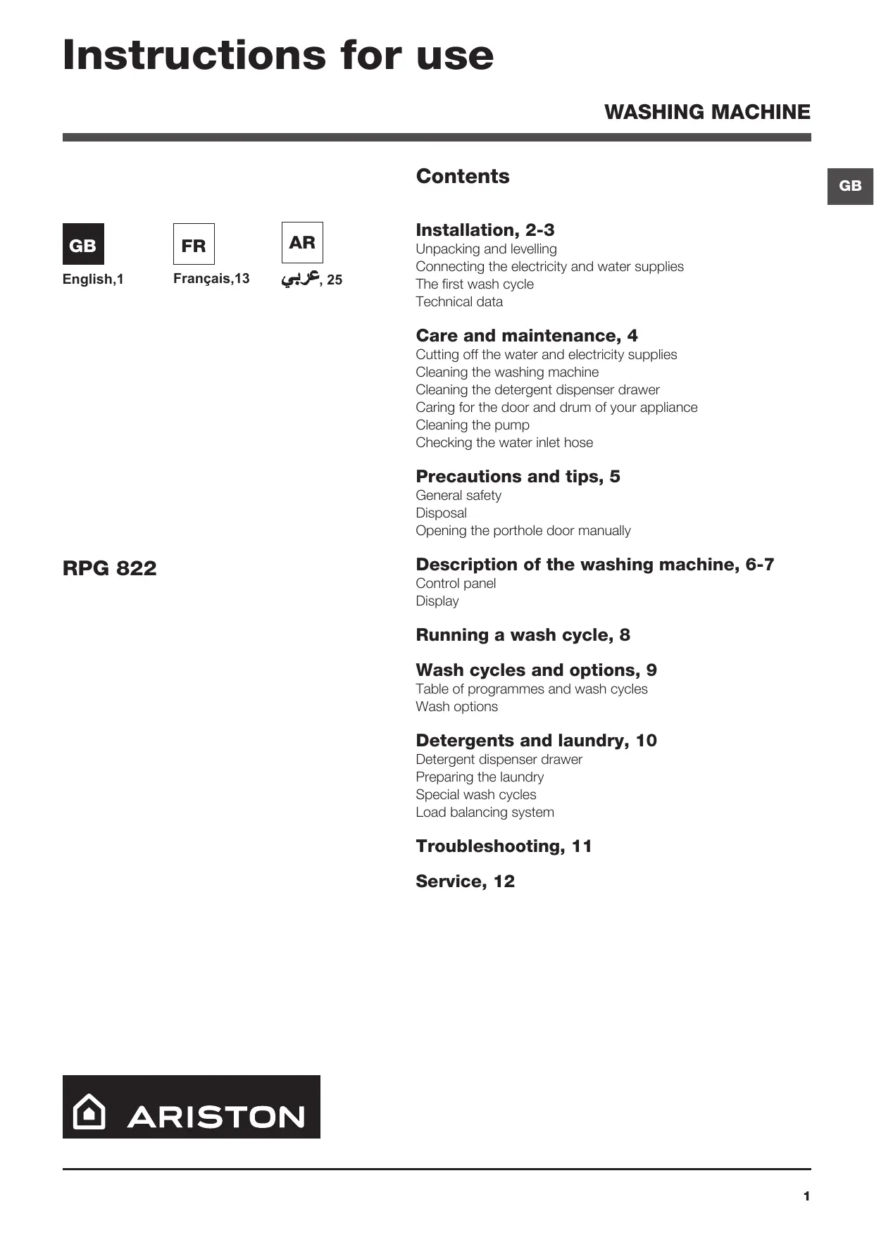 USER MANUAL RPG 822 KK EX HOTPOINT