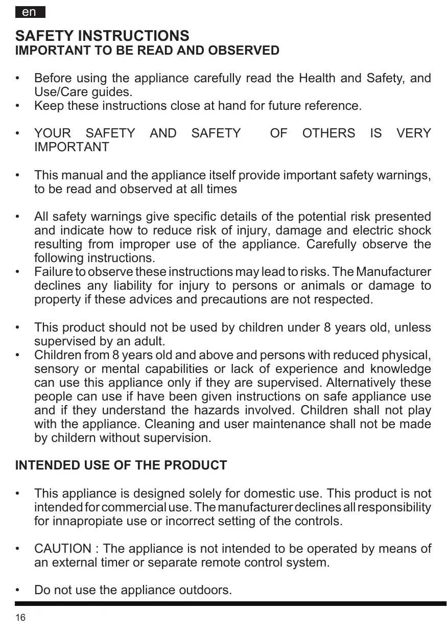 This appliance is designed solely for domestic use. This product is not intended for commercial use. The manufacturer declines all responsibility for innapropiate use or incorrect setting of the controls.