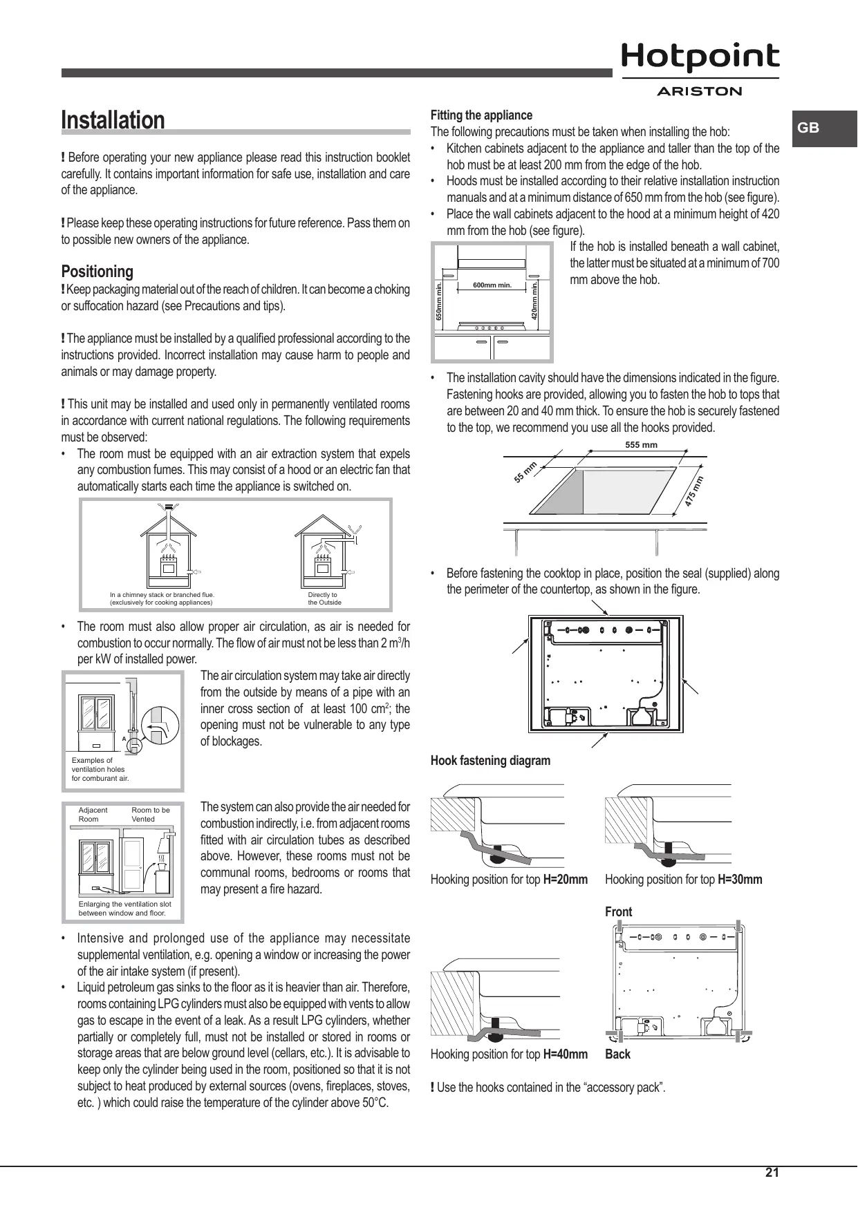Fastening hooks are provided, allowing you to fasten the hob to tops that are between 20 and 40 mm thick. To ensure the hob is securely fastened to the top, we recommend you use all the hooks provided. 555 mm 55
