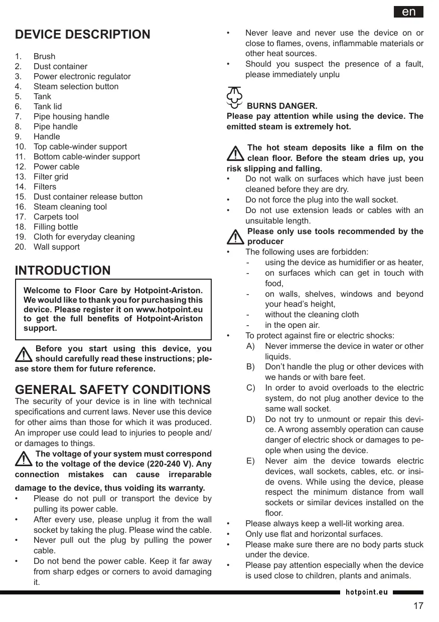 Brush Dust container Power electronic regulator Steam selection button Tank Tank lid Pipe housing handle Pipe handle Handle Top cable-winder support Bottom cable-winder support Power cable Filter grid Filters Dust container release button Steam cleaning tool Carpets tool Filling bottle Cloth for everyday cleaning Wall support INTRODUCTION Welcome to Floor Care by Hotpoint-Ariston. We would like to thank you for purchasing this device. Please register it on www.hotpoint.eu to get the full benefits of Hotpoint-Ariston support. Before you start using this device, you should carefully read these instructions; please store them for future reference.