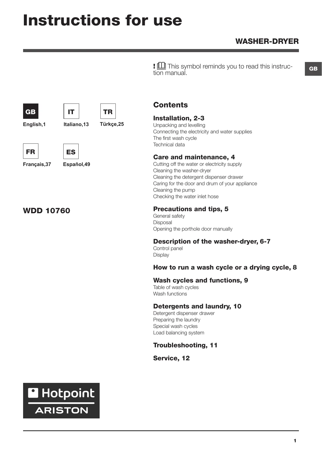 Download the instructions for your Washer dryer in PDF format for free! Find your manual WDD 10760BX EU - HOTPOINT and take your electronic device back in hand. On this page are published all the documents necessary for the use of your device. WDD 10760BX EU by HOTPOINT.