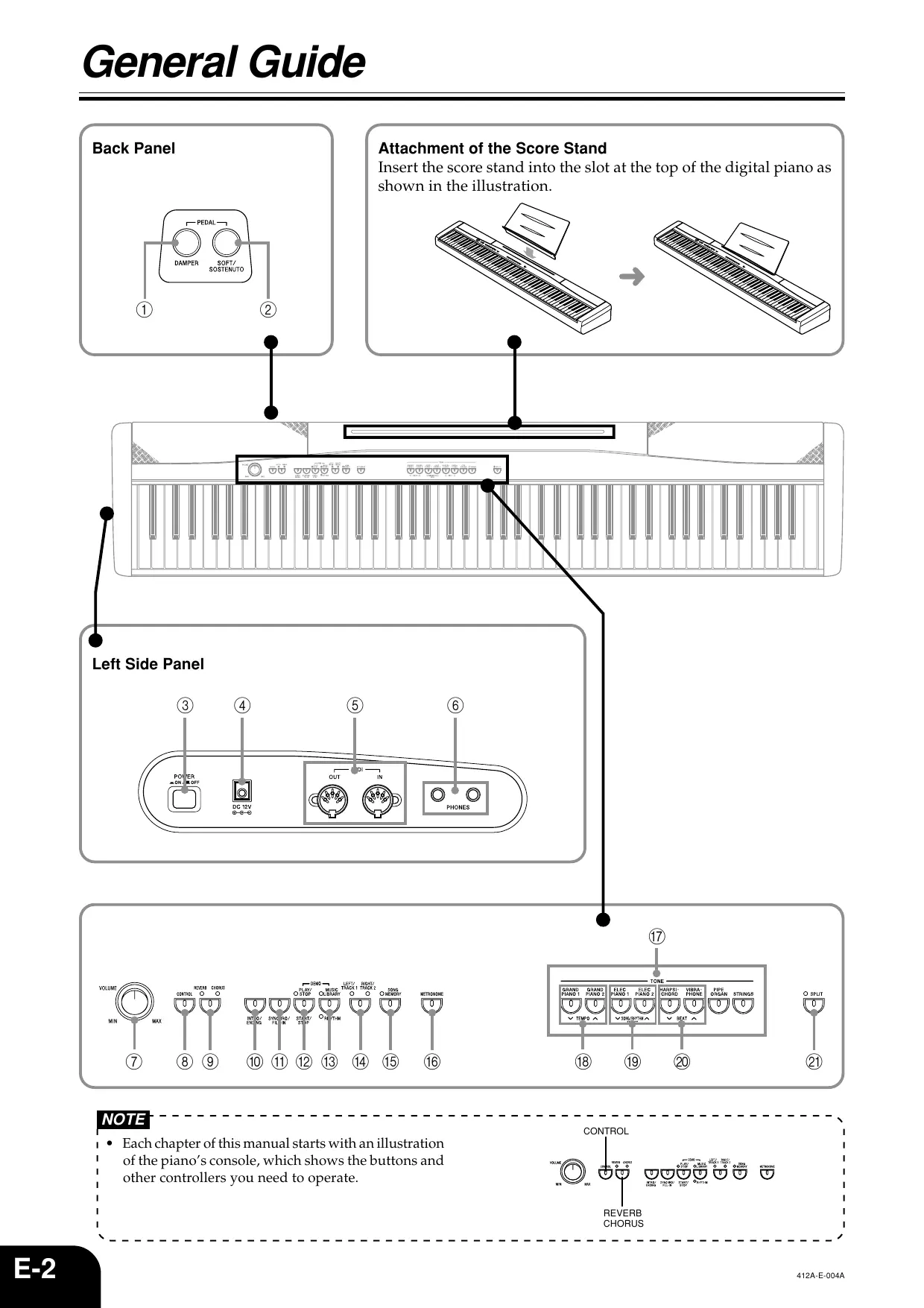 General Guide Back Panel Attachment of the Score Stand Insert the score stand into the slot at the top of the digital piano as shown in the illustration. (è à Left Side Panel © © © (Oo) 1 + Each chapter of this manual starts with an illustration of the pianos console, which shows the buttons and other controllers you need to operate. REVERB AY2RE004A