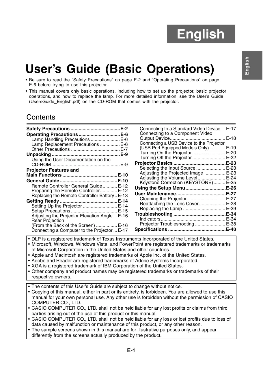+ This manual covers only basic operations, including how to set up the projector, basic projector operations, and how to replace the lamp. For more detailed information, see the Users Guide {UsersGuide_English.pdf) on the CD-ROM that comes with the projector.