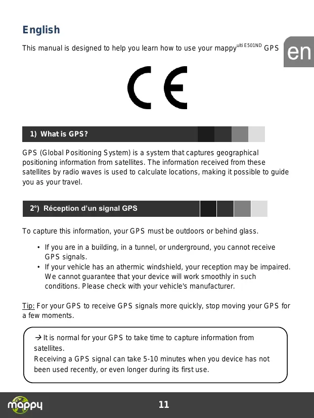 GPS (Global Positioning System) is a system that captures geographical positioning information from satellites. The information received from these satellites by radio waves is used to calculate locations, making it possible to guide you as your travel. 2°) Réception d’un signal GPS To capture this information, your GPS must be outdoors or behind glass.
