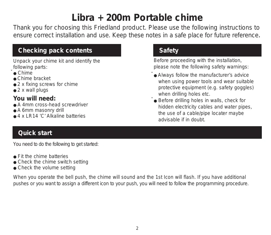Solutions to improve the quality of life This product may be purchased from Connevans Limited secure online store at www.DeafEquipment.co.uk DeafEquipment.co.uk Solutions to improve the quality of life 48333PL Ed1 Instruction Manual D917S/D918S Libra+ 200m portable chime Installation and Use Libra + 200m Portable chime Libra + 200m Portable chime Thank you for choosing this Friedland product. Please use the following instructions to ensure correct installation and use. Keep these notes in a safe place for future reference. Checking pack contents Safety Before proceeding with the installation, please note the following safety warnings: Unpack your chime kit and identify the following parts: ¬● Chime ● Chime bracket ● 2 x fixing screws for chime ● 2 x wall plugs ¬● Always follow the manufacturer’s advice when using power tools and wear suitable protective equipment (e.g. safety goggles) when drilling holes etc. ¬ Before drilling holes in walls, check for hidden electricity cables and water pipes, the use of a cable/pipe locater maybe advisable if in doubt. You will need: