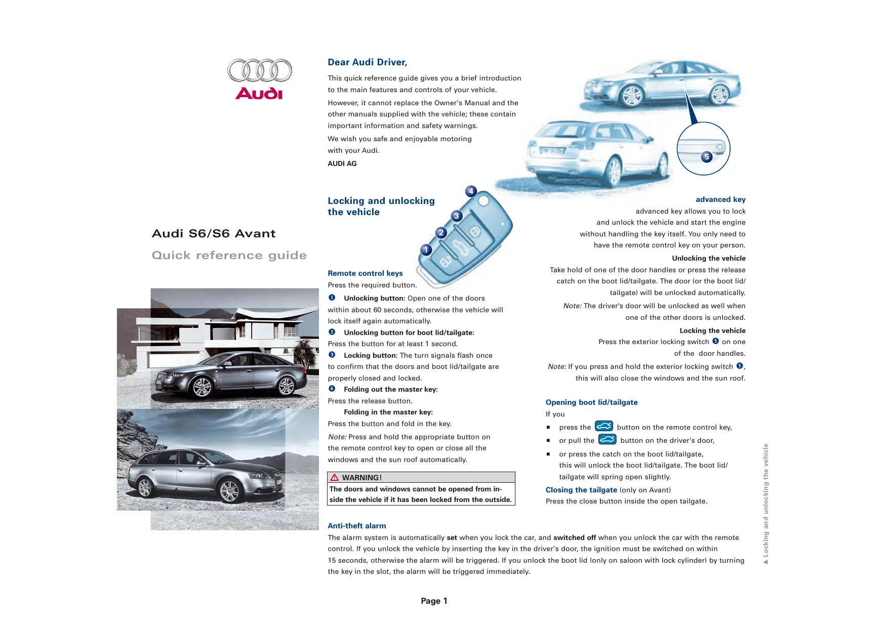 Audi S6/S6 Avant Quick reference guide Dear Audi Driver, This quick reference guide gives you a brief introduction to the main features and controls of your vehicle. However, it cannot replace the Owner's Manual and the other manuals supplied with the vehicle; these contain important information and safety warnings. We wish you safe and enjoyable mot with your Audi. AUDI AG advanced key advanced key allows you to lock and unlock the vehicle and start the engine Locking and unlocking the vehicle without handling the key itself. You only need to have the remote control key on your person. Unlocking the vehicle Take hold of one of the door handles or press the release catch on the boot lid/tailgate. The door (or the boot lid/ Remote control keys Press the required button. “= . tailgate) will be unlocked automatically. © Unlocking button: Open one of the doors Note: The driver's door will be unlocked as well when within about 60 seconds, otherwise the vehicle will one of the other doors is unlocked. lock itself again automatically. © Unlocking button for boot lid/tailgate: Locking the vehicle Press the button for at least 1 second. Press the exterior locking switch @ on one © Locking button: The turn signals flash once ofthe door handles. to confirm that the doors and boot lid/tailgate are Note: If you press and hold the exterior locking switch @, properly closed and locked. this will also close the windows and the sun roof. © Folding out the master key: Press the release button. Opening boot lid/tailgate Folding in the master key: H you Press the button and fold in the key. "press the ÆÆ3 button on the remote control key, Note: Press and hold the appropriate button on = or pullthe 53 button on the driver's door, the remote control key to open or close all the "or press the catch on the boot lid/tailgate, this will unlock the boot lid/tailgate. The boot lid/ À WARNING! tailgate will spring open slightiy. The doors and windows cannot be opened from in- Closing the tailgate (only on Avant) le the vehicle if it has been locked from the outside. Press the close button inside the open tailgate. windows and the sun roof automatically. Anti-theft alarm The alarm system is automatically set when you lock the car, and switched off when you unlock the car with the remote control. If you unlock the vehicle by inserting the key in the driver's door, the ignition must be switched on within 15 seconds, otherwise the alarm will be triggered. If you unlock the boot lid (only on saloon with lock cylinden) by tur the key in the slot, the alarm will be triggered immediately. Page 1 A Locking and u