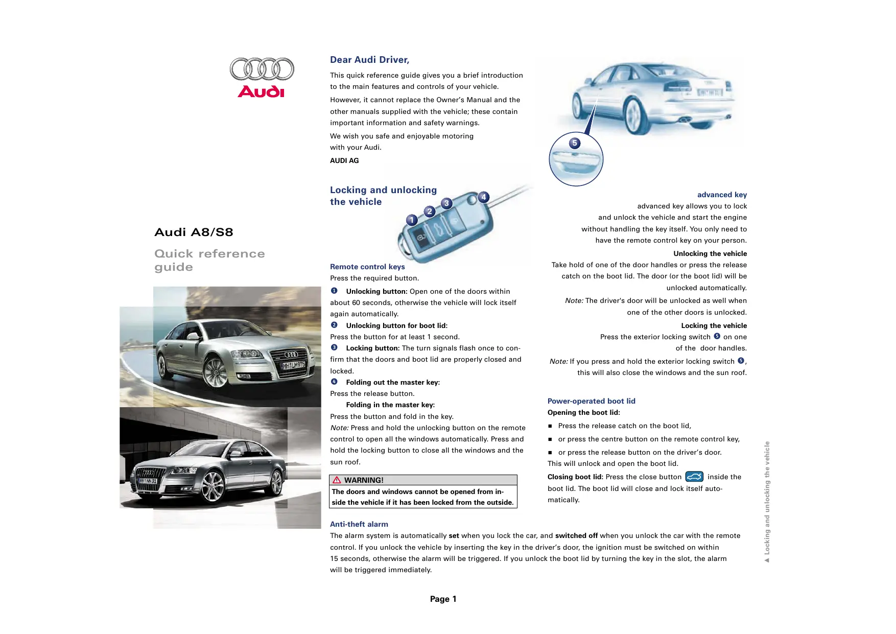 Dear Audi Driver, This quick reference guide gives you a brief introduction to the main features and controls of your vehicle. However, it cannot replace the Owner's Manual and the other manuals supplied with the vehicle; these contain important information and safety warnings. We wish you safe and enjoyable motoring with your Audi. AUDI AG Locking and unlocking the vehicle Remote control keys Press the required button. © Unlocking button: Open one of the doors within about 60 seconds, otherwise the vehicle will lock itself again automatically. © Unlocking button for boot lid: Press the button for at least 1 second. © Locking button: The turn signals flash once to con- firm that the doors and boot lid are properly closed and locked. © Folding out the master key: Press the release button. Folding in the master key: Press the button and fold in the key. Note: Press and hold the unlocking button on the remote control to open all the windows automatically. Press and hold the locking button to close all the windows and the sun roof. À WARNING! The doors and windows cannot be opened from side the vehicle if it has been locked from the outside. Anti-theft alarm advanced key advanced key allows you to lock and unlock the vehicle and start the engine without handling the key itself. You only need to have the remote control key on your person. Unlocking the vehicle Take hold of one of the door handles or press the release catch on the boot lid. The door (or the boot lid} will be unlocked automatically. Note: The drivers door will be unlocked as well when one of the other doors is unlocked. Locking the vehicle Press the exterior locking switch @ on one of the door handies. Note: If you press and hold the exterior locking switch ©, this will also close the windows and the sun roof. Power-operated boot lid Opening the boot lid: = Press the release catch on the boot lid, =_or press the centre button on the remote control key, =_or press the release button on the drivers door. This will unlock and open the boot lid. Closing boot lid: Press the close button (2) inside the boot lid. The boot lid will close and lock itself auto- matically. The alarm system is automatically set when you lock the car, and switched off when you unlock the car with the remote control. If you unlock the vehicle by inserting the key 15 seconds, otherwise the alarm will be triggered. If you unlock the boot lid by turt will be triggered immediately. Page 1 the drivers door, the ignition must be switched on within ng the key in the slot, the alarm locking the vehicle