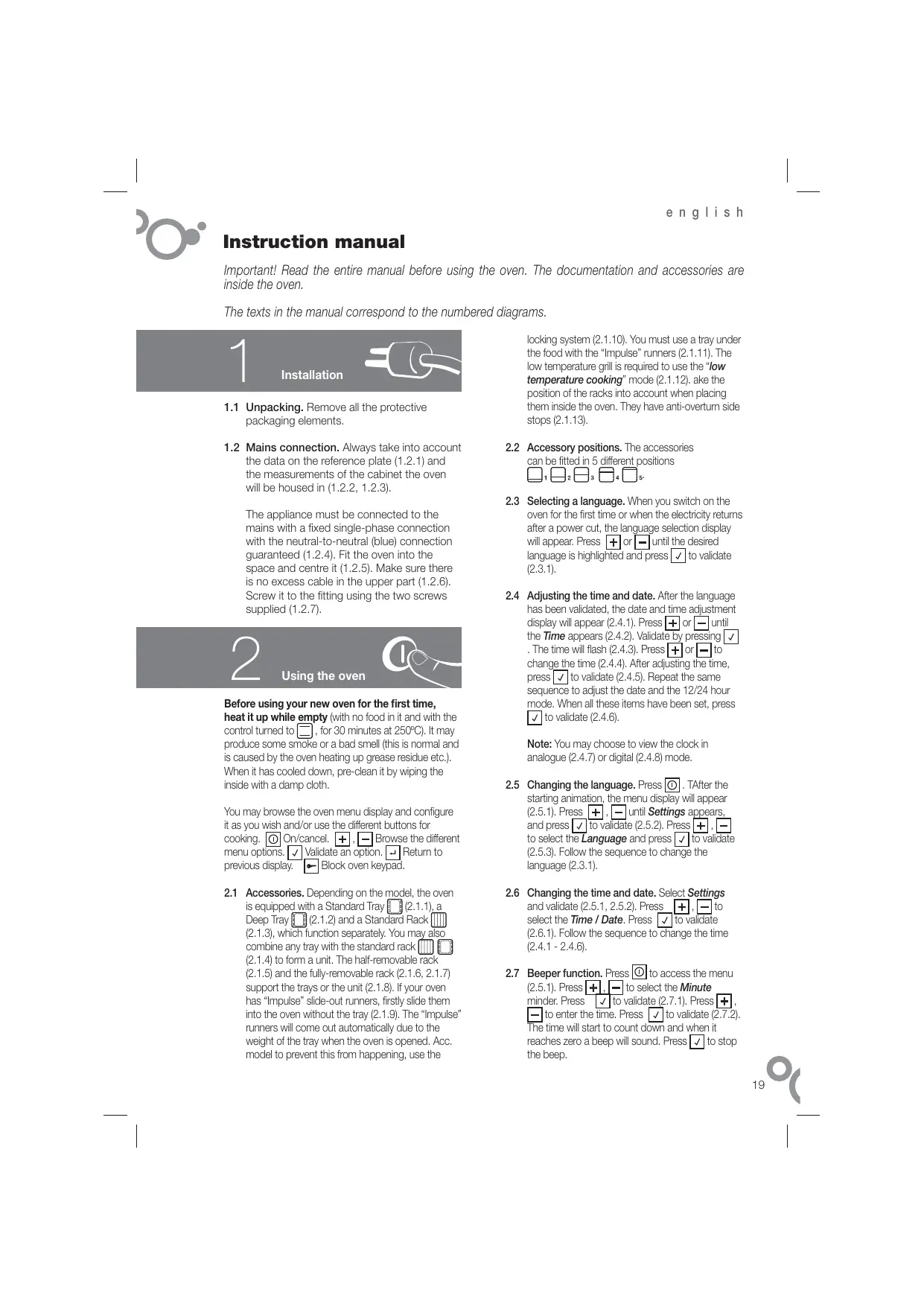 locking system (2.1.10). You must use a tray under the food with the “Impulse” runners (2.1.11). The low temperature grill is required to use the “low temperature cooking” mode (2.1.12). ake the position of the racks into account when placing them inside the oven. They have anti-overturn side stops (2.1.13). 2.2 Accessory positions. The accessories can be fitted in 5 different positions . 2.3 Selecting a language. When you switch on the oven for the first time or when the electricity returns after a power cut, the language selection display will appear. Press or until the desired language is highlighted and press to validate (2.3.1). 2.4 Adjusting the time and date. After the language has been validated, the date and time adjustment display will appear (2.4.1). Press or until the Time appears (2.4.2). Validate by pressing . The time will flash (2.4.3). Press or to change the time (2.4.4). After adjusting the time, press to validate (2.4.5). Repeat the same sequence to adjust the date and the 12/24 hour mode. When all these items have been set, press to validate (2.4.6). Note: You may choose to view the clock in analogue (2.4.7) or digital (2.4.8) mode. 2.5 Changing the language. Press . TAfter the starting animation, the menu display will appear (2.5.1). Press , until Settings appears, and press to validate (2.5.2). Press , to select the Language and press to validate (2.5.3). Follow the sequence to change the language (2.3.1). 2.6 Changing the time and date. Select Settings , to and validate (2.5.1, 2.5.2). Press select the Time / Date. Press to validate (2.6.1). Follow the sequence to change the time (2.4.1 - 2.4.6). 2.7 Beeper function. Press to access the menu (2.5.1). Press , to select the Minute minder. Press to validate (2.7.1). Press , to enter the time. Press to validate (2.7.2). The time will start to count down and when it reaches zero a beep will sound. Press to stop the beep. 19