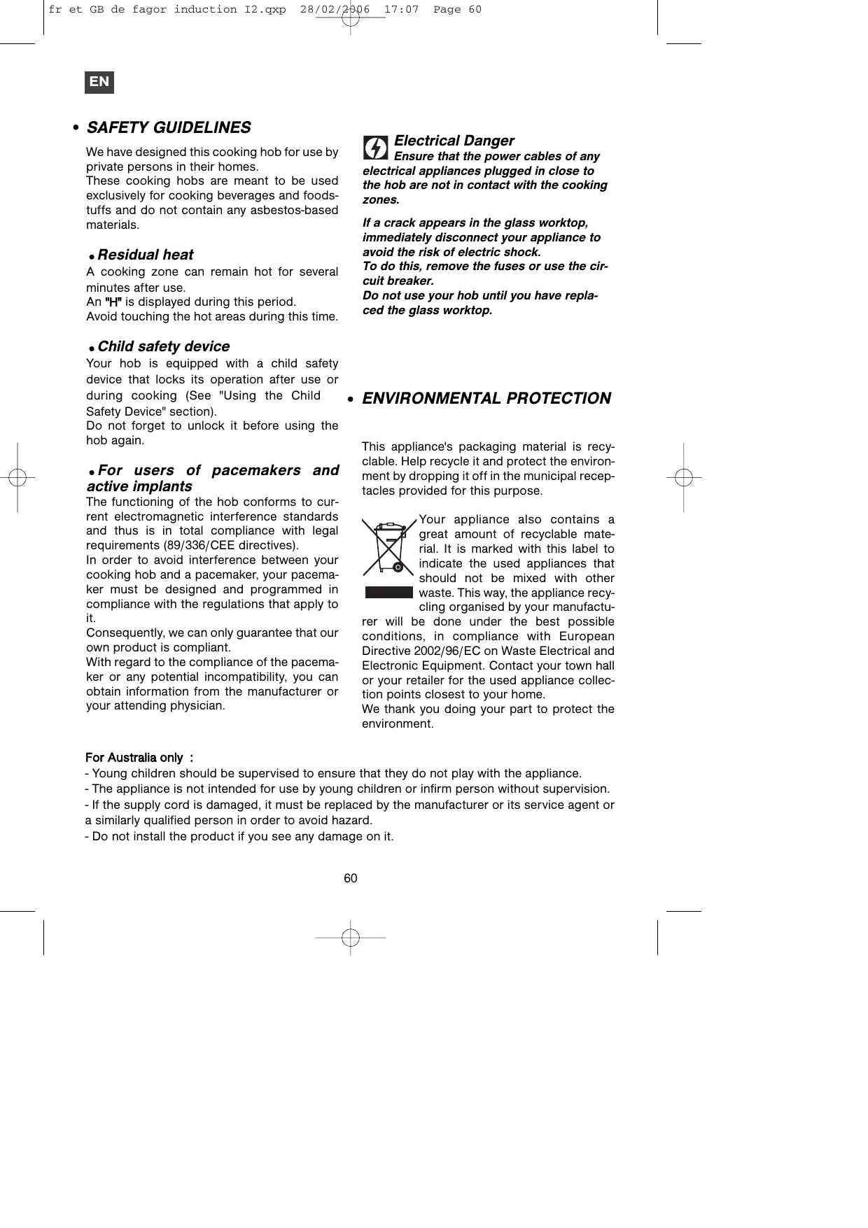 - For users of pacemakers and active implants The functioning of the hob conforms to current electromagnetic interference standards and thus is in total compliance with legal requirements (89/336/CEE directives). In order to avoid interference between your cooking hob and a pacemaker, your pacemaker must be designed and programmed in compliance with the regulations that apply to it. Consequently, we can only guarantee that our own product is compliant. With regard to the compliance of the pacemaker or any potential incompatibility, you can obtain information from the manufacturer or your attending physician. Your appliance also contains a great amount of recyclable material. It is marked with this label to indicate the used appliances that should not be mixed with other waste. This way, the appliance recycling organised by your manufacturer will be done under the best possible conditions, in compliance with European Directive 2002/96/EC on Waste Electrical and Electronic Equipment. Contact your town hall or your retailer for the used appliance collection points closest to your home. We thank you doing your part to protect the environment. For Australia only : - Young children should be supervised to ensure that they do not play with the appliance. - The appliance is not intended for use by young children or infirm person without supervision. - If the supply cord is damaged, it must be replaced by the manufacturer or its service agent or a similarly qualified person in order to avoid hazard. - Do not install the product if you see any damage on it.