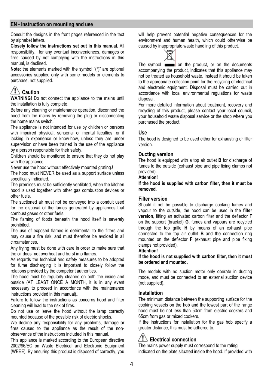 Instruction on mounting and use Prescriptions de montage et mode d’emploi Montage- und Gebrauchsanweisung Montaje y modo de empleo Instruções para montagem e utilização Montagevoorschriften en gebruiksaanwijzingen Návod na montáž a používání Návod k montáži a užití Felszerelési és használati utasítás Инструкции по монтажу и эксплуатации EN - Instruction on mounting and use Consult the designs in the front pages referenced in the text by alphabet letters. Closely follow the instructions set out in this manual. All responsibility, for any eventual inconveniences, damages or fires caused by not complying with the instructions in this manual, is declined. Note: the elements marked with the symbol “(*)” are optional accessories supplied only with some models or elements to purchase, not supplied. will help prevent potential negative consequences for the environment and human health, which could otherwise be caused by inappropriate waste handling of this product. on the product, or on the documents The symbol accompanying the product, indicates that this appliance may not be treated as household waste. Instead it should be taken to the appropriate collection point for the recycling of electrical and electronic equipment. Disposal must be carried out in accordance with local environmental regulations for waste disposal. For more detailed information about treatment, recovery and recycling of this product, please contact your local council, your household waste disposal service or the shop where you purchased the product. Caution WARNING! Do not connect the appliance to the mains until the installation is fully complete. Before any cleaning or maintenance operation, disconnect the hood from the mains by removing the plug or disconnecting the home mains switch. The appliance is not intended for use by children or persons with impaired physical, sensorial or mental faculties, or if lacking in experience or know-how, unless they are under supervision or have been trained in the use of the appliance by a person responsible for their safety. Children should be monitored to ensure that they do not play with the appliance. Never use the hood without effectively mounted grating.! The hood must NEVER be used as a support surface unless specifically indicated. The premises must be sufficiently ventilated, when the kitchen hood is used together with other gas combustion devices or other fuels. The suctioned air must not be conveyed into a conduit used for the disposal of the fumes generated by appliances that combust gases or other fuels. The flaming of foods beneath the hood itself is severely prohibited. The use of exposed flames is detrimental to the filters and may cause a fire risk, and must therefore be avoided in all circumstances. Any frying must be done with care in order to make sure that the oil does not overheat and burst into flames. As regards the technical and safety measures to be adopted for fume discharging it is important to closely follow the relations provided by the competent authorities. The hood must be regularly cleaned on both the inside and outside (AT LEAST ONCE A MONTH, it is in any event necessary to proceed in accordance with the maintenance instructions provided in this manual).. Failure to follow the instructions as concerns hood and filter cleaning will lead to the risk of fires. Do not use or leave the hood without the lamp correctly mounted because of the possible risk of electric shocks. We decline any responsibility for any problems, damage or fires caused to the appliance as the result of the nonobservance of the instructions included in this manual. This appliance is marked according to the European directive 2002/96/EC on Waste Electrical and Electronic Equipment (WEEE). By ensuring this product is disposed of correctly, you Use The hood is designed to be used either for exhausting or filter version. Ducting version The hood is equipped with a top air outlet B for discharge of fumes to the outside (exhaust pipe and pipe fixing clamps not provided). Attention! If the hood is supplied with carbon filter, then it must be removed. Filter version Should it not be possible to discharge cooking fumes and vapour to the outside, the hood can be used in the filter version, fitting an activated carbon filter and the deflector F on the support (bracket) G, fumes and vapours are recycled through the top grille H by means of an exhaust pipe connected to the top air outlet B and the connection ring mounted on the deflector F (exhaust pipe and pipe fixing clamps not provided). Attention! If the hood is not supplied with carbon filter, then it must be ordered and mounted. The models with no suction motor only operate in ducting mode, and must be connected to an external suction device (not supplied). Installation The minimum distance between the supporting surface for the cooking vessels on the hob and the lowest part of the range hood must be not less than 50cm from electric cookers and 65cm from gas or mixed cookers. If the instructions for installation for the gas hob specify a greater distance, this must be adhered to. Electrical connection The mains power supply must correspond to the rating indicated on the plate situated inside the hood. If provided with