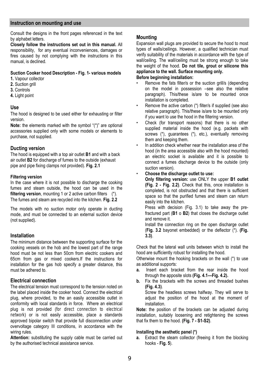 Use The hood is designed to be used either for exhausting or filter version. Note: the elements marked with the symbol “(*)” are optional accessories supplied only with some models or elements to purchase, not supplied. Ducting version The hood is equipped with a top air outlet B1 and with a back air outlet B2 for discharge of fumes to the outside (exhaust pipe and pipe fixing clamps not provided). Fig. 2.1 Filtering version In the case where it is not possible to discharge the cooking fumes and steam outside, the hood can be used in the filtering version, mounting 1 or 2 active carbon filters (*). The fumes and steam are recycled into the kitchen. Fig. 2.2 The models with no suction motor only operate in ducting mode, and must be connected to an external suction device (not supplied). Installation The minimum distance between the supporting surface for the cooking vessels on the hob and the lowest part of the range hood must be not less than 50cm from electric cookers and 65cm from gas or mixed cookers.If the instructions for installation for the gas hob specify a greater distance, this must be adhered to. Check that the lateral wall units between which to install the hood are sufficiently robust for installing the hood. Otherwise mount the hooking brackets on the wall (*) to use as additional supports: a. Insert each bracket from the rear inside the hood through the apposite slots (Fig. 4.1—Fig. 4.2). b. Fix the brackets with the screws and threaded bushes (Fig. 4.3). Screw the headless screws halfway. They will serve to adjust the position of the hood at the moment of installation. Note: the position of the brackets can be adjusted during installation, suitably loosening and retightening the screws that fix them to the hood. (Fig. 7 - S1-S2). Electrical connection The electrical tension must correspond to the tension noted on the label placed inside the cooker hood. Connect the electrical plug, where provided, to the an easily accessible outlet in conformity with local standards in force. Where an electrical plug is not provided (for direct connection to electrical network) or is not easily accessible, place a standards approved bipolar switch that provide full disconnection under overvoltage category III conditions, in accordance with the wiring rules. Attention: substituting the supply cable must be carried out by the authorised technical assistance service. Installing the aesthetic panel (*) a. Extract the steam collector (freeing it from the blocking hooks - Fig. 5).