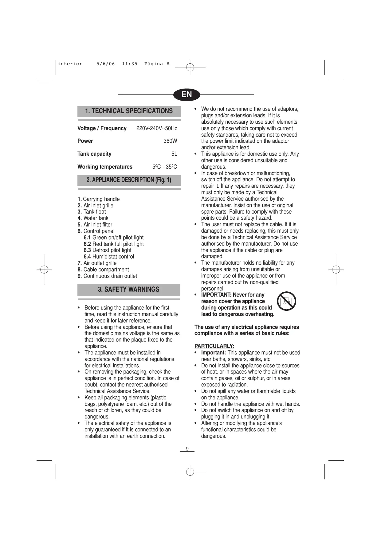 - IMPORTANT: Never for any reason cover the appliance during operation as this could lead to dangerous overheating. Tank capacity Working temperatures